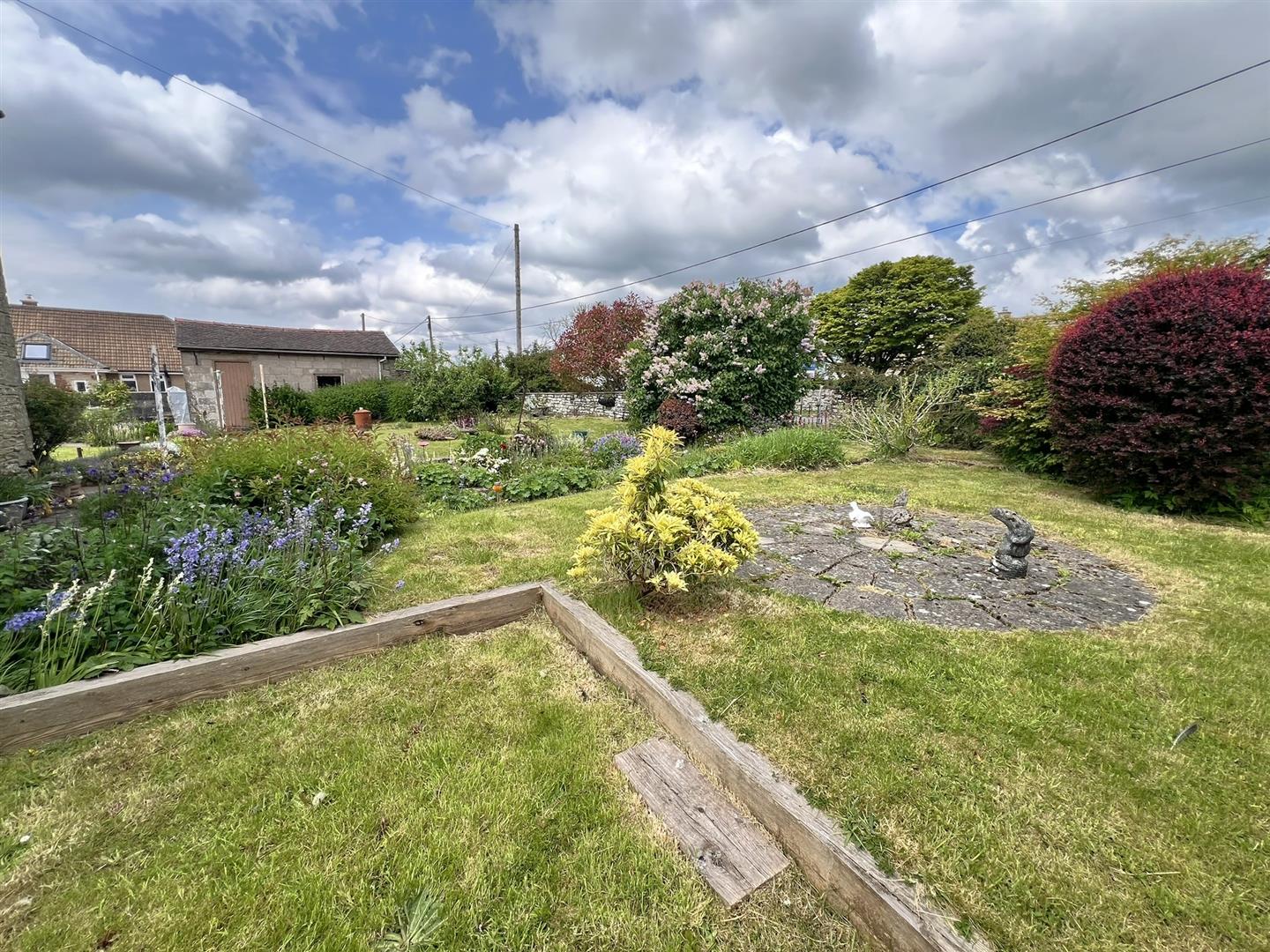 On the right-hand side, the garden features flower borders, a dwarf wall, an additional large lawned area, and a pathway leading to the rear door. This area also includes a septic tank, a storage shed, gravelled raised beds, outside lighting, and an outdoor tap.