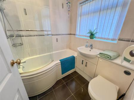 Bathroom - 1.73m x 1.83m (5'08 x 6'00) - White suite with modern P shaped side panel bath, curved shower screen, mixer tap over, electric shower fitted, vanity wash hand basin with monobloc mixer tap and cupboard beneath, concealed cistern w.c, fully tiled walls and flooring, chrome heated towel radiator, ceiling light, extractor fan, front aspect upvc obscure double glazed window.