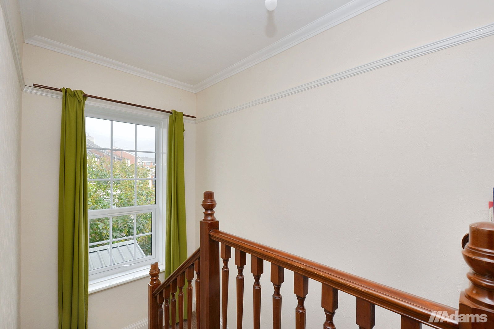 A polished hardwood spindle staircase rises to a light-filled landing, giving access to five well-proportioned bedrooms. The accommodation is served by a family bathroom with panelled bath and electric shower, complemented by an adjoining cloakroom WC. Bedrooms feature built-in wardrobes or wash hand basins, and those positioned to the front of the house enjoy elevated views towards the River Mersey.
