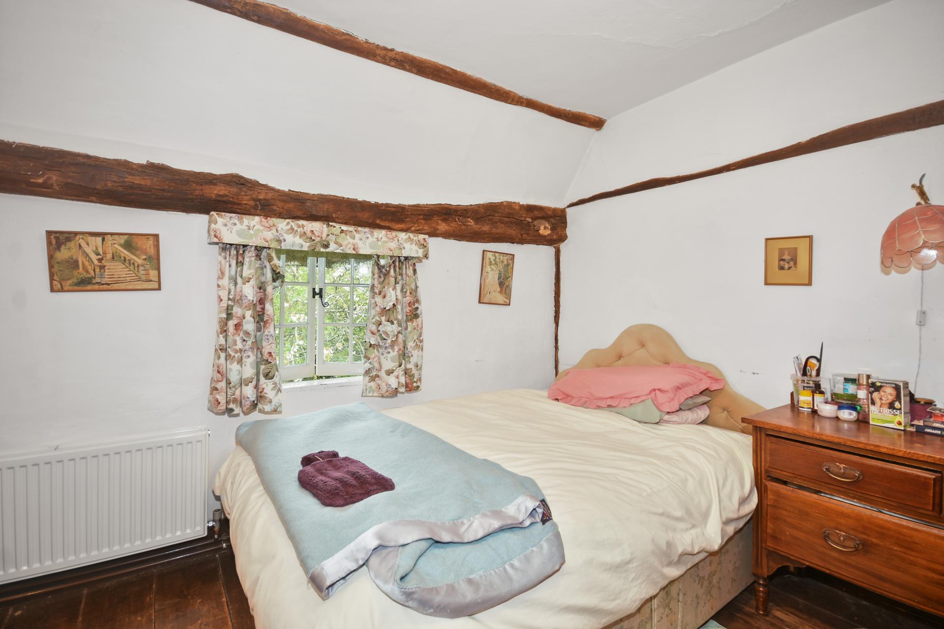 Bedroom: Casement window to the front. Extensive wall and ceiling beams. Exposed brick fireplace with bressummer beam over (not in use). Wide board oak floor.