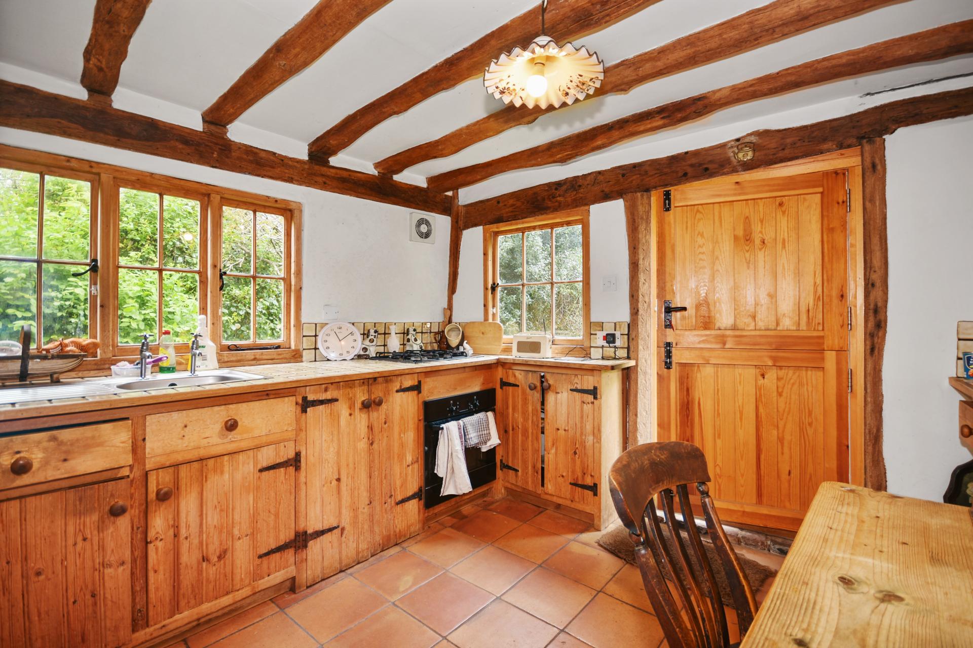 Kitchen/Breakfast Room: Wooden stable door to the front, wooden casement windows to front and side. Fitted with range of wooden base and wall units with tiled wood edge worktop over, inset with single bowl, single drainer stainless steel sink unit. Plumbing for dishwasher. Four ring gas hob with electric oven below. Space for under counter larder fridge. Extensive exposed beams. Tiled floor. Exposed brick wall. Extractor. Space for breakfast table.