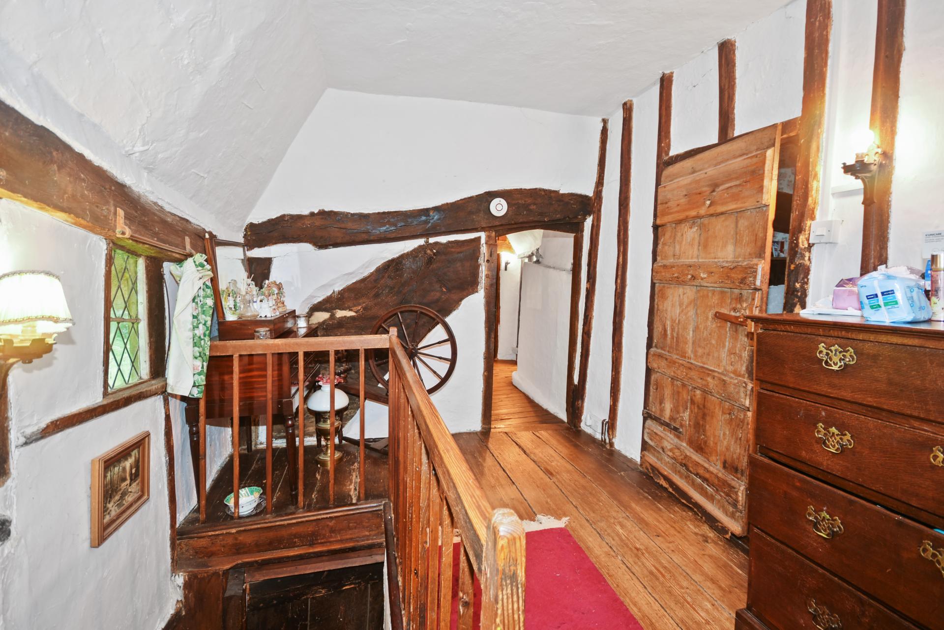 Landing: Two small windows to the rear. Extensive wall and ceiling beams. Wide board oak floor.