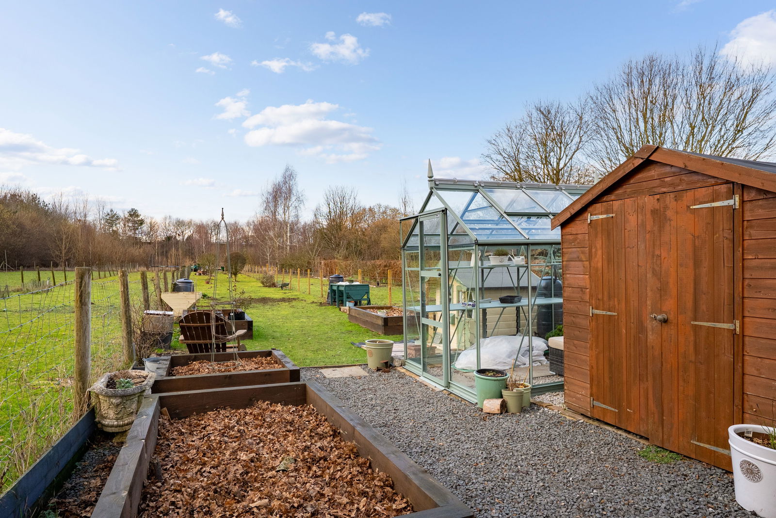 • Exceptional outdoor space with multiple entertaining terraces, a greenhouse, and raised beds, plus the benefit of a substantial detached garage and driveway parking