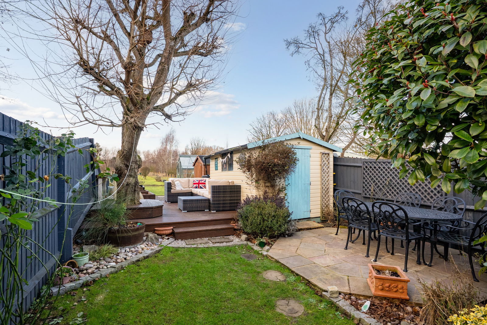 To the front, the property enjoys a picturesque and quintessentially English setting, framed by mature trees. This prime position within the village is complemented by a driveway providing off-road parking and access to a substantial detached garage. The rear garden has been thoughtfully landscaped to create a private sanctuary with multiple zones for relaxation and outdoor dining. A paved patio area, provides an intimate spot for morning coffee, while a larger sun deck and secondary stone terrace offer ample space for hosting summer gatherings. The grounds are further enhanced by a manicured lawn, a variety of mature trees, and practical features including a greenhouse, a timber garden shed and raised planter beds.
