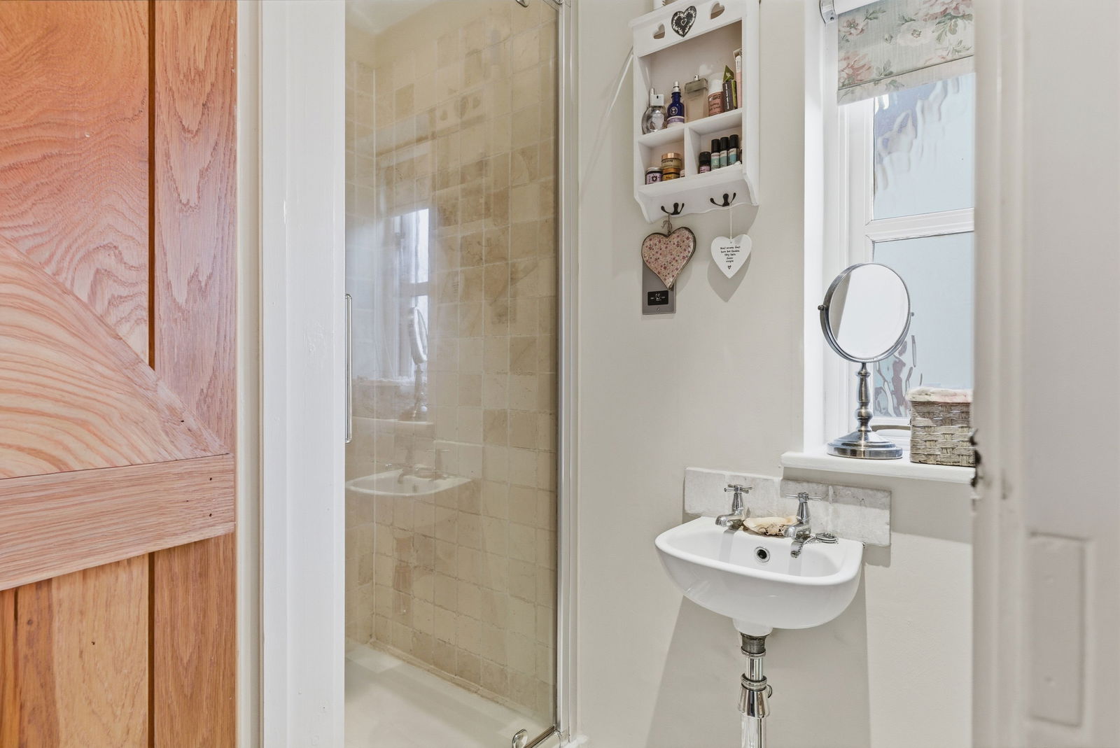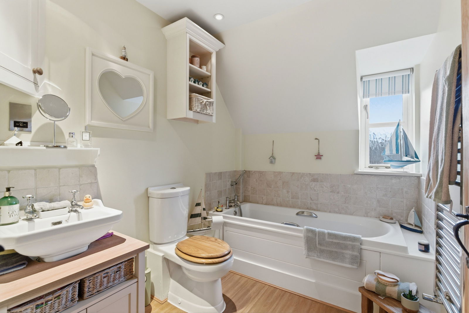The first floor continues the theme of understated elegance and character, comprising three bedrooms and a stylish family bathroom. The principal bedroom is a delightful retreat with a window that offers views over the surrounding area. It benefits from ample space for storage and the added luxury of a private en-suite shower room. The second bedroom is a double, similarly bright and airy with views over the garden. The third bedroom is a versatile space, currently utilised as a charming child's room, and features a large skylight. Serving the bedrooms is a beautifully appointed family bathroom featuring a classic wood-panelled bath, wash hand basin, WC and heated towel rail.
