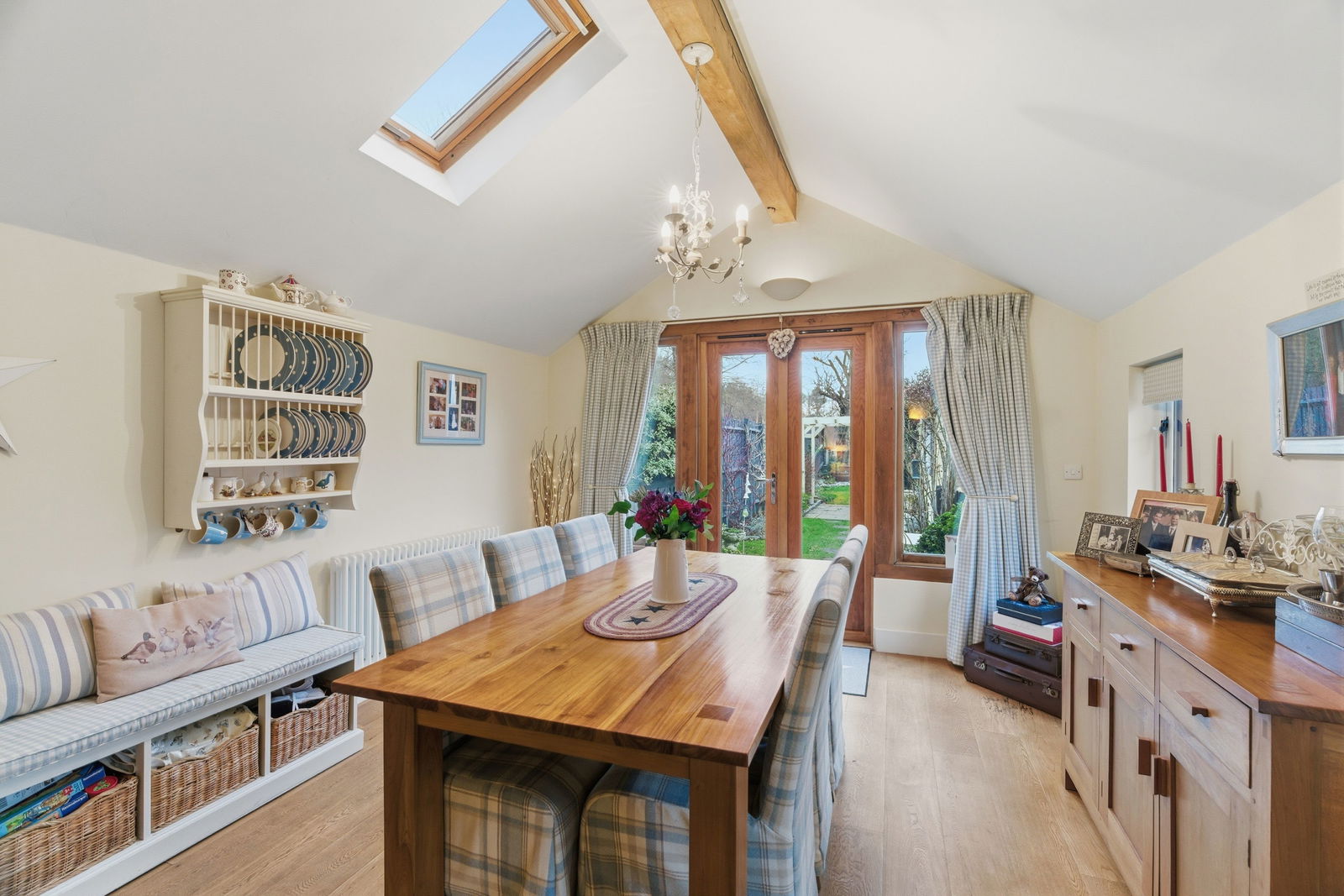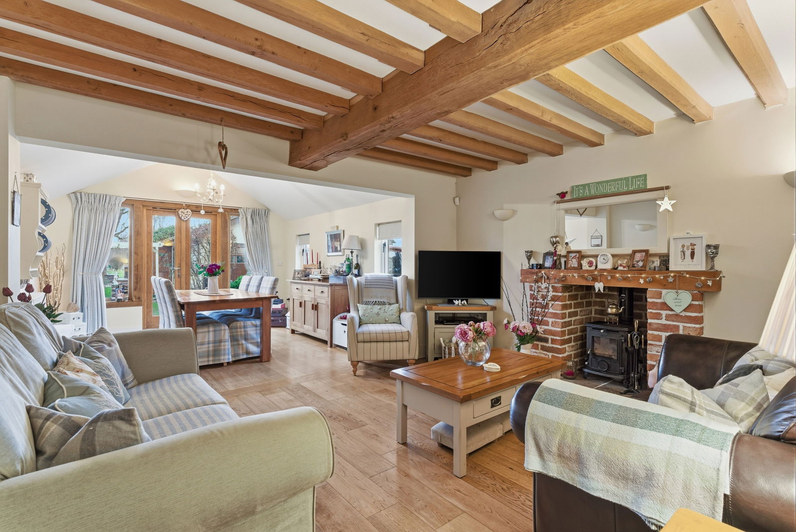 Pekin Cottage is a quietly handsome home built in 2009 yet designed with a sensitivity more often associated with older houses, it has the reassuring presence of a cottage that feels settled and established. The home opens into a welcoming entrance hall that immediately sets a tone of light and warmth and a discreetly positioned cloakroom/WC. This leads seamlessly into a stunning open-plan kitchen and breakfast room fitted only three years ago. Here, elegant shaker-style cabinetry is paired with solid wood, work surfaces, integrated dishwasher, washing machine, fridge/freezer and a classic white butler sink. Characterful exposed timber beams and a central breakfast bar island create a social hub. The living accommodation continues into a generous sitting room, where a feature brick fireplace with an inset wood-burning stove serves as a cozy focal point. This space flows effortlessly into an impressive, vaulted, family/dining room featuring a large skylight and French doors that offer a direct connection to the rear garden.