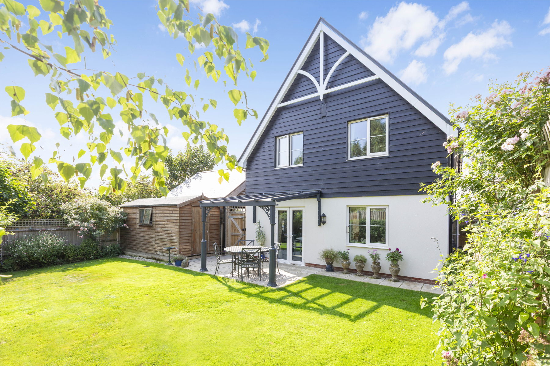 The rear GARDEN is fully enclosed and designed for easy maintenance, laid to lawn with well-planted borders and a patio beneath a covered pergola, a perfect spot for relaxing or entertaining. A large SHED, also equipped with power and lighting, offers excellent additional storage and could be adapted for use as a home office.