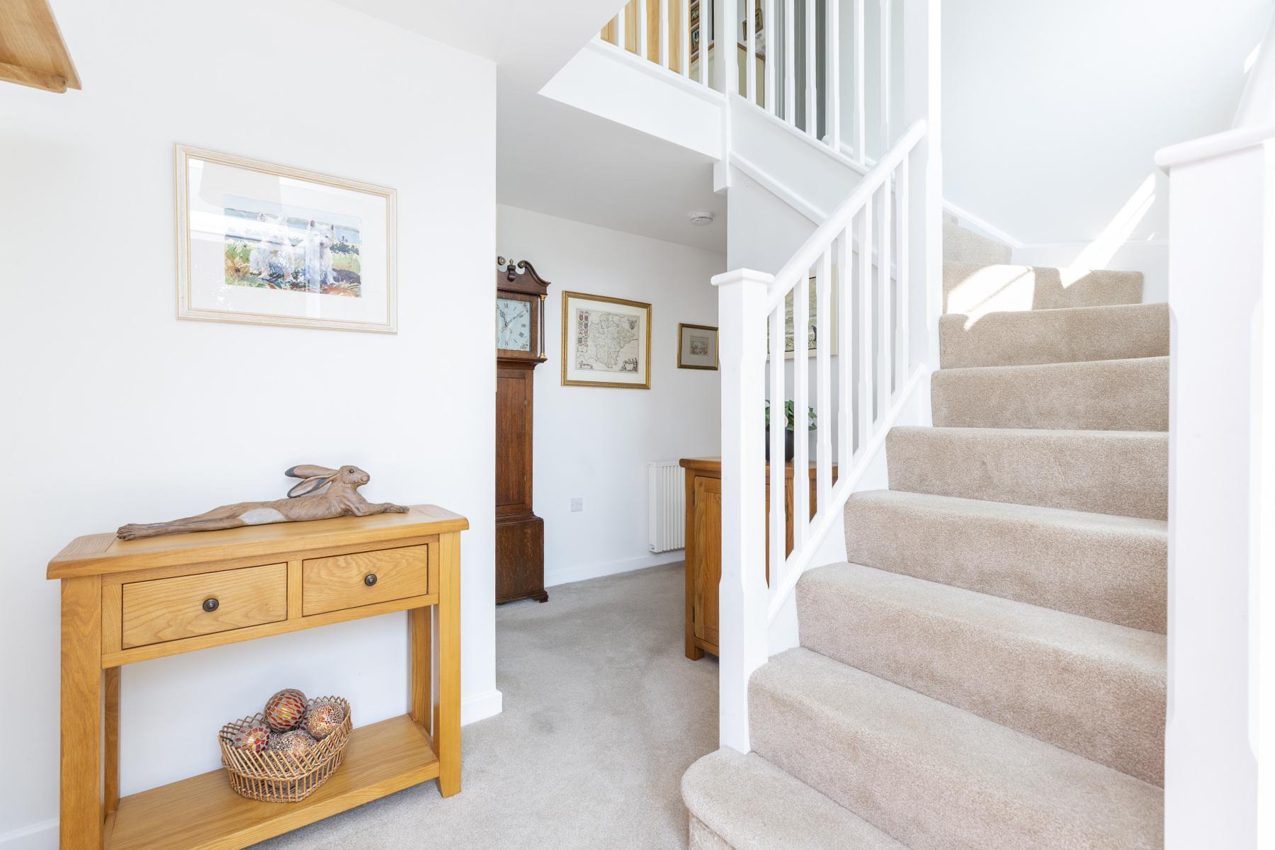 Off the kitchen is a practical UTILITY ROOM with plumbing and space for a washing machine and tumble dryer, along with further storage. The house has a natural, sociable flow, with the SITTING ROOM accessible from both the hallway and the kitchen/dining room. A lovely space to relax, it is filled with light from two double-glazed windows and French doors leading to the garden. Also on the ground floor is a CLOAKROOM with space for coats and shoes, a W.C., and a wash hand basin.