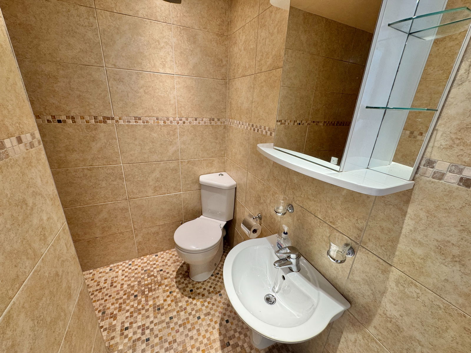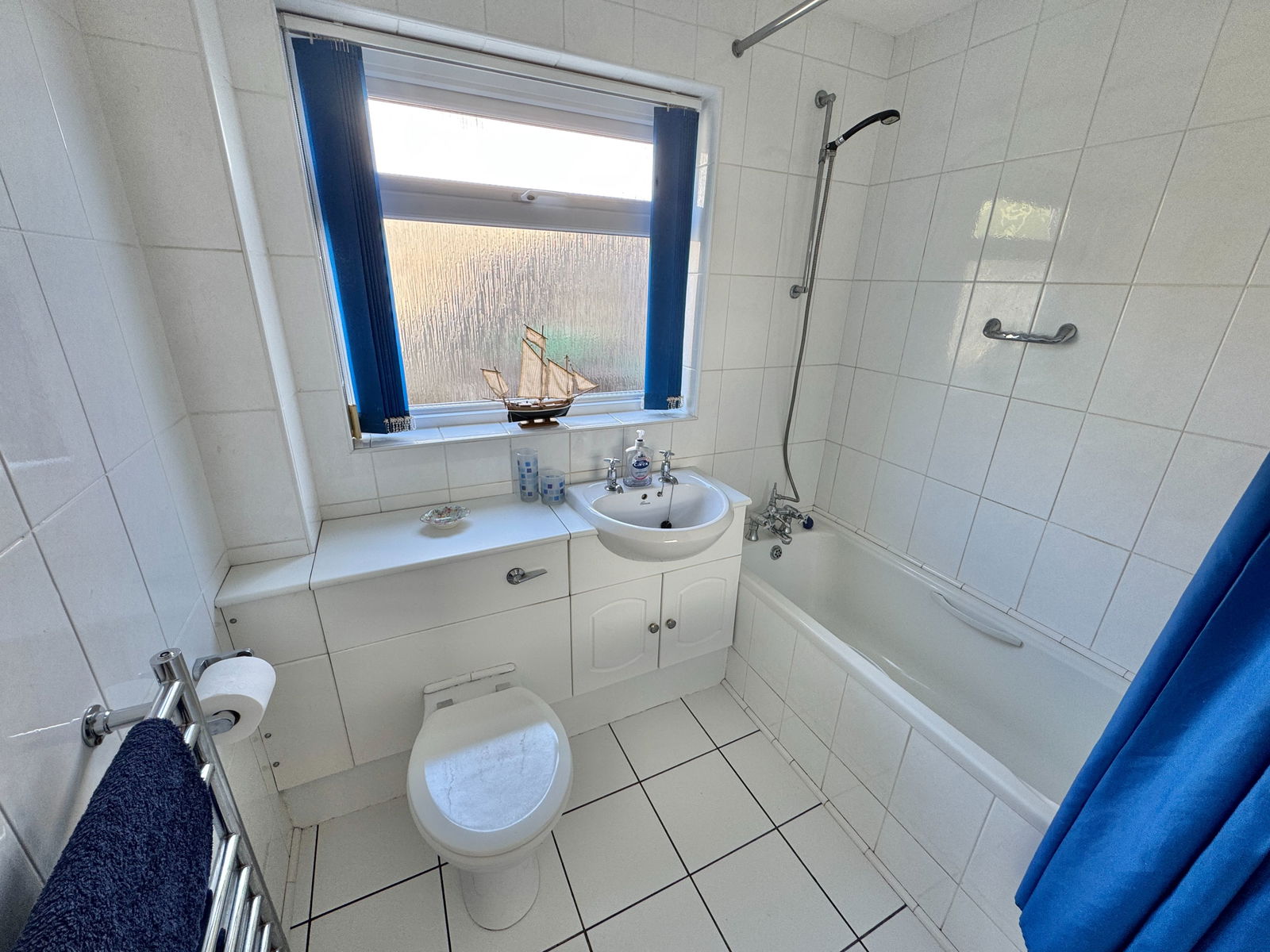 The family bathroom is fitted with a matching white 3-piece suite comprising, a low-level WC, wash hand basin, tiled enclosed bath with shower unit over, a window to the side elevation, spotlights, and a chrome towel rail.
