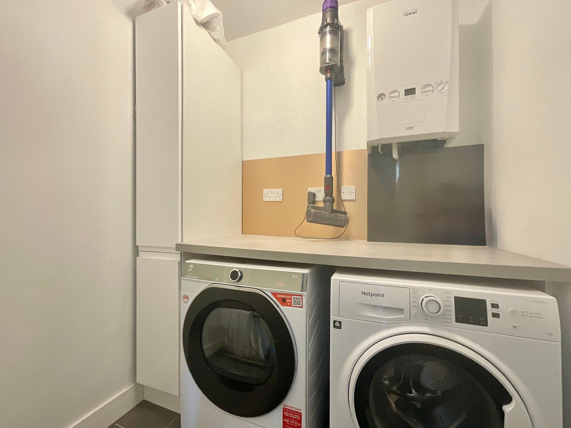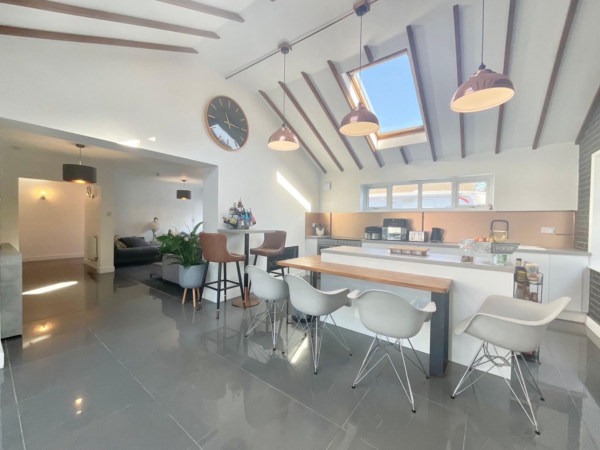- Modern open-plan kitchen with integrated appliances including a quadruple oven, induction hob, dishwasher, and a central island with breakfast bar.