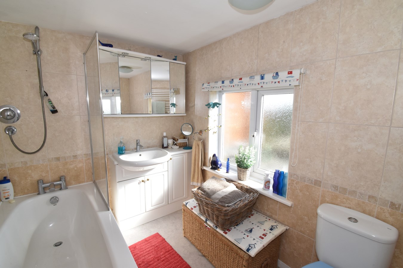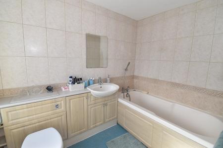 9' 4" x 6' 5" (2.84m x 1.96m) Double glazed frosted window to rear. White suite of low level wc, vanity hand basin with further cupboard to one side and mirrored cabinet above. Panelled bath with separate shower unit. Fully tiled. Heated towel rail. Radiator.
