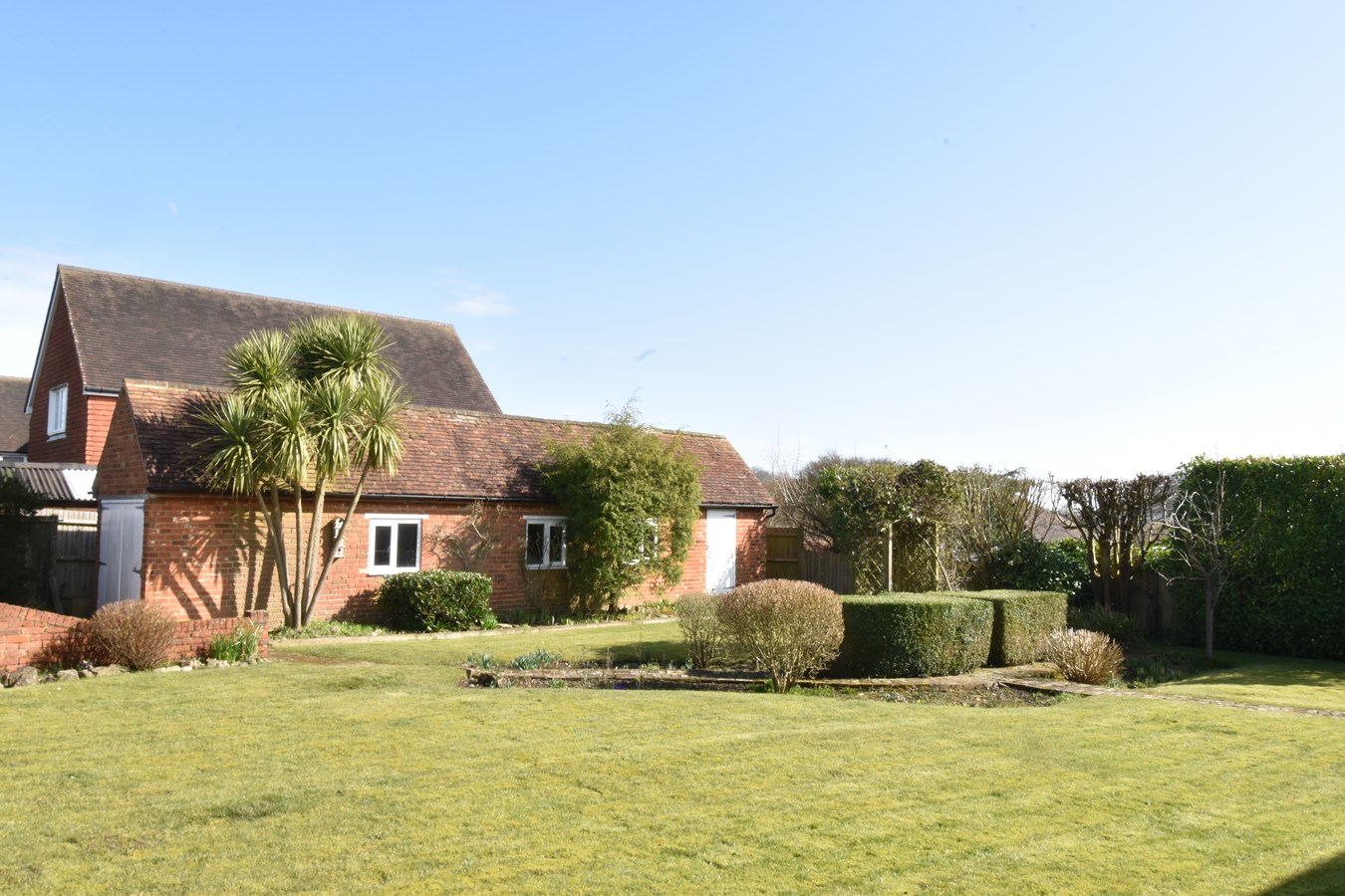Enclosed by hedging and fencing. Laid mainly to lawn. Extensive shingled parking area.