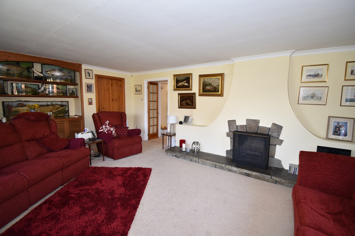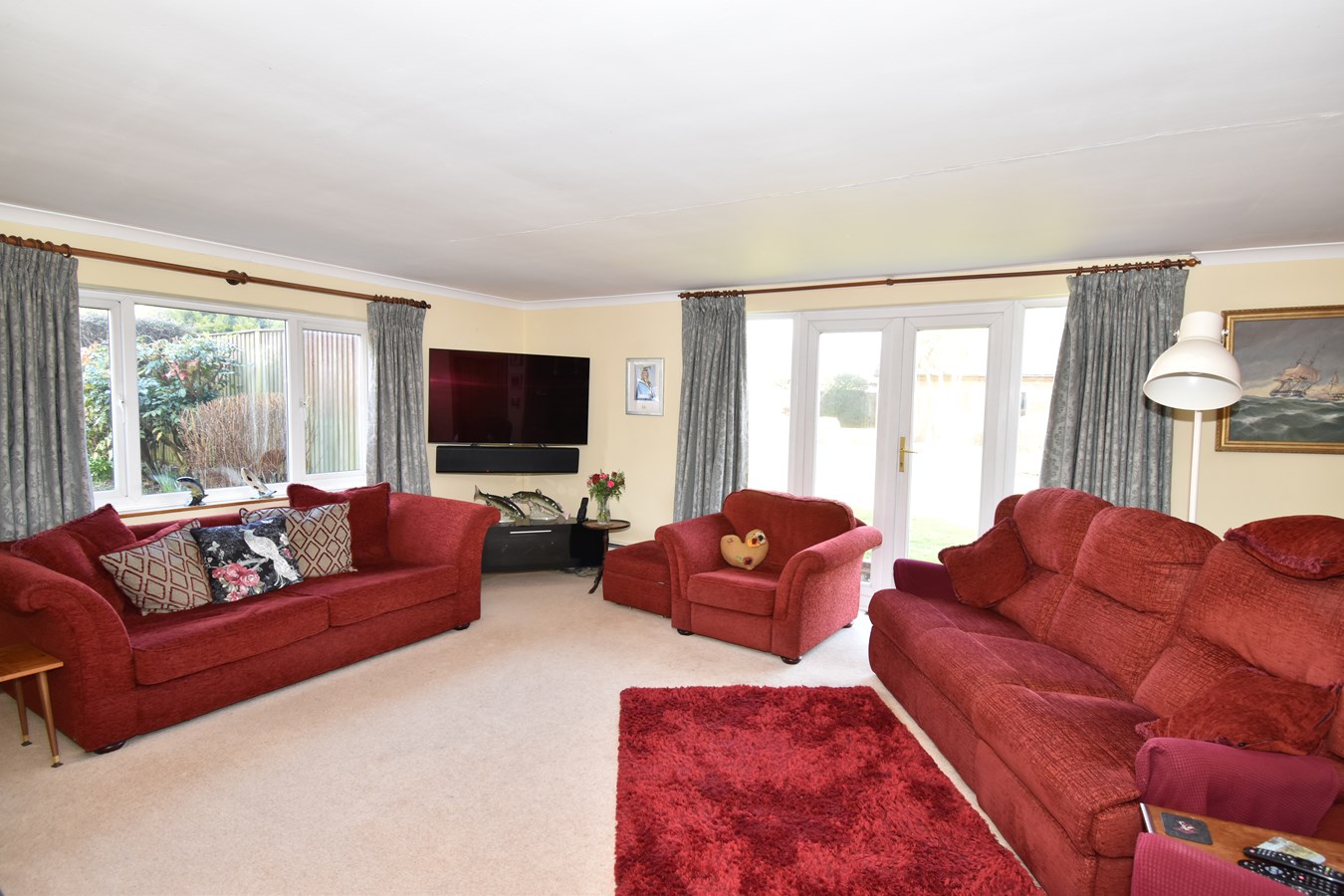 18' 0" x 15' 9" (5.49m x 4.80m) Double glazed window to front and double glazed doors and full length windows to side overlooking garden. Feature open fireplace. Set of louvre doored cupboards. Skirting board heating. Television point.