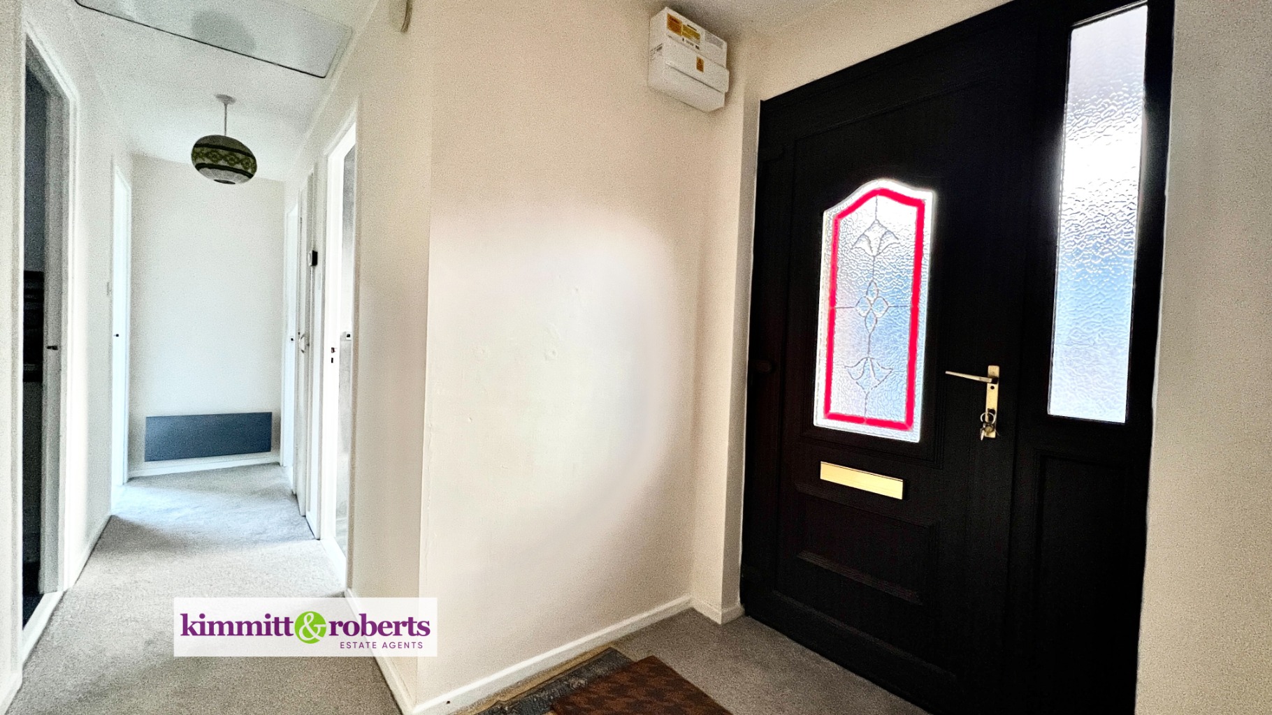 Entrance Hallwith part glazed entrance door, cupboard, windows, loft hatch and electric panel radiator