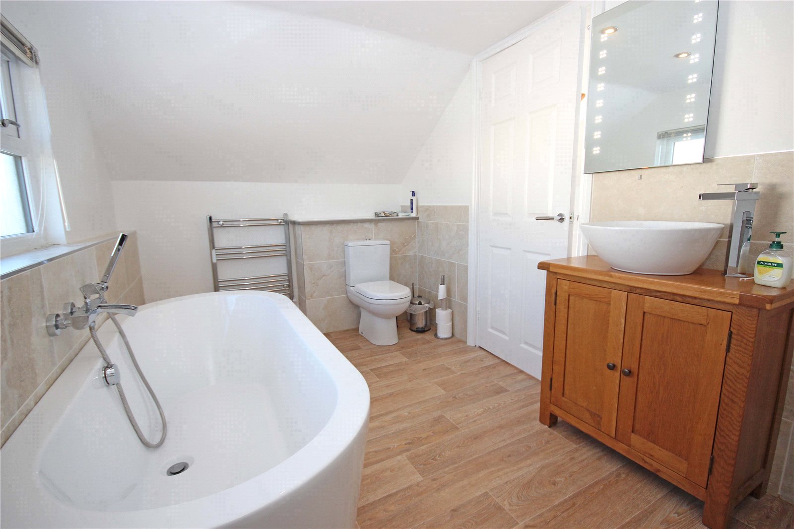 The main bathroom benefits from a P shaped bath with shower overhead and chrome mixer tap, bowl style hand basin with oak vanity unit below, toilet, obscured glass window and double fronted pull-out storage drawer. The downstairs bathrooms benefit from electric underfloor heating, extractor fans and shaving sockets.
