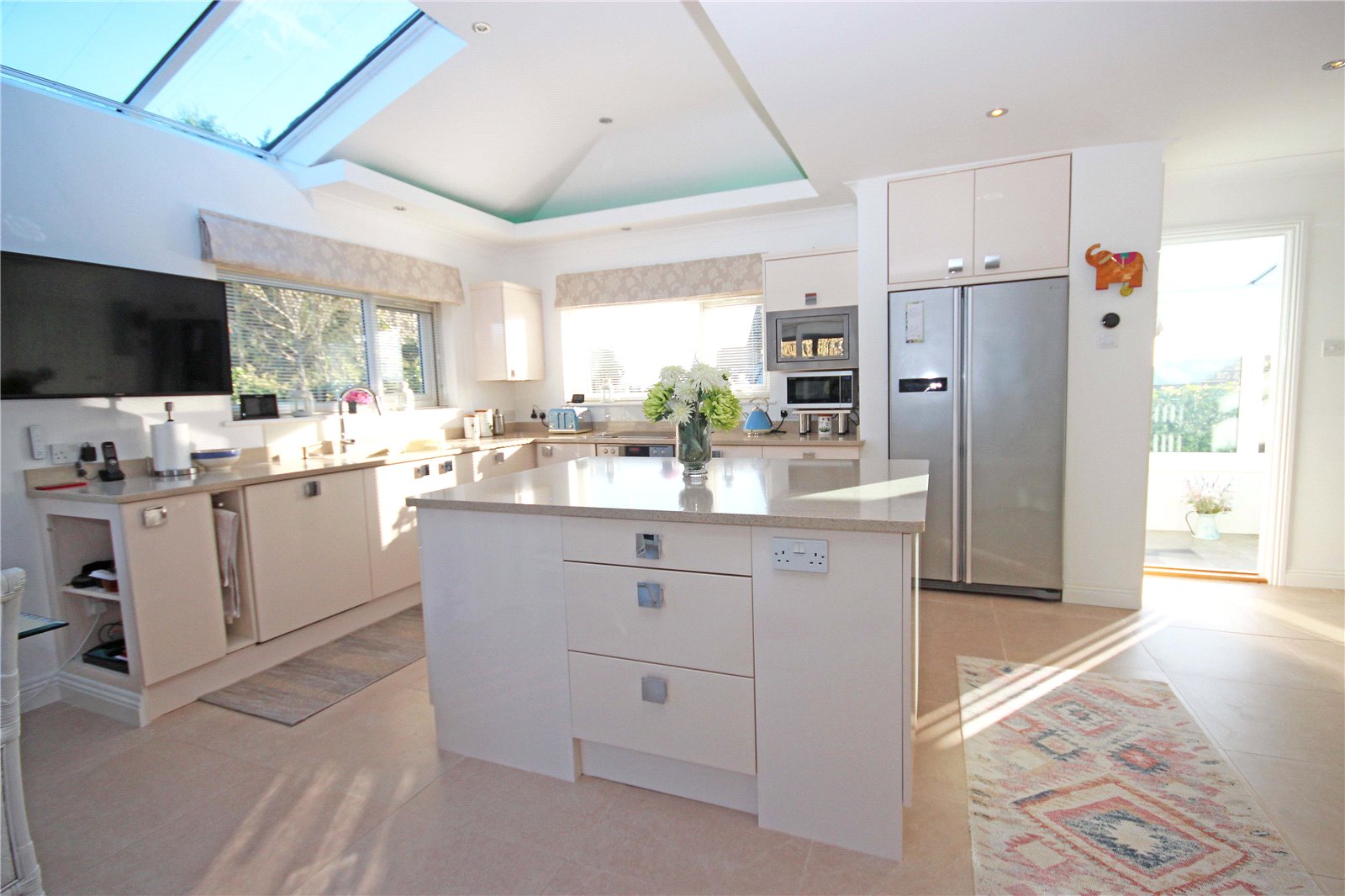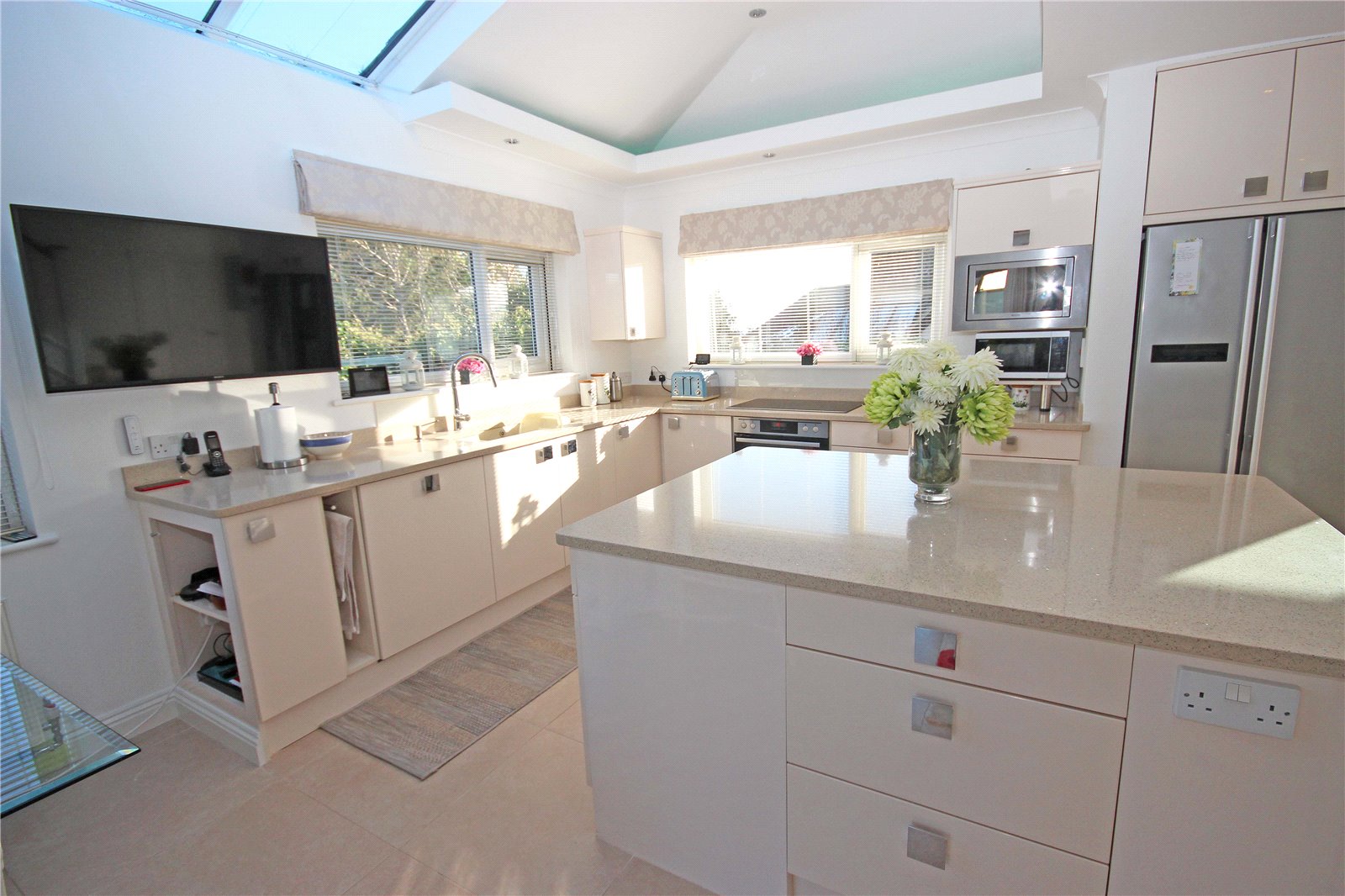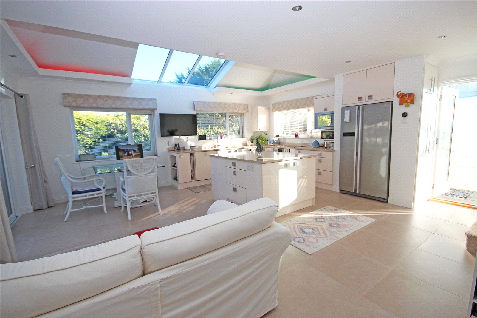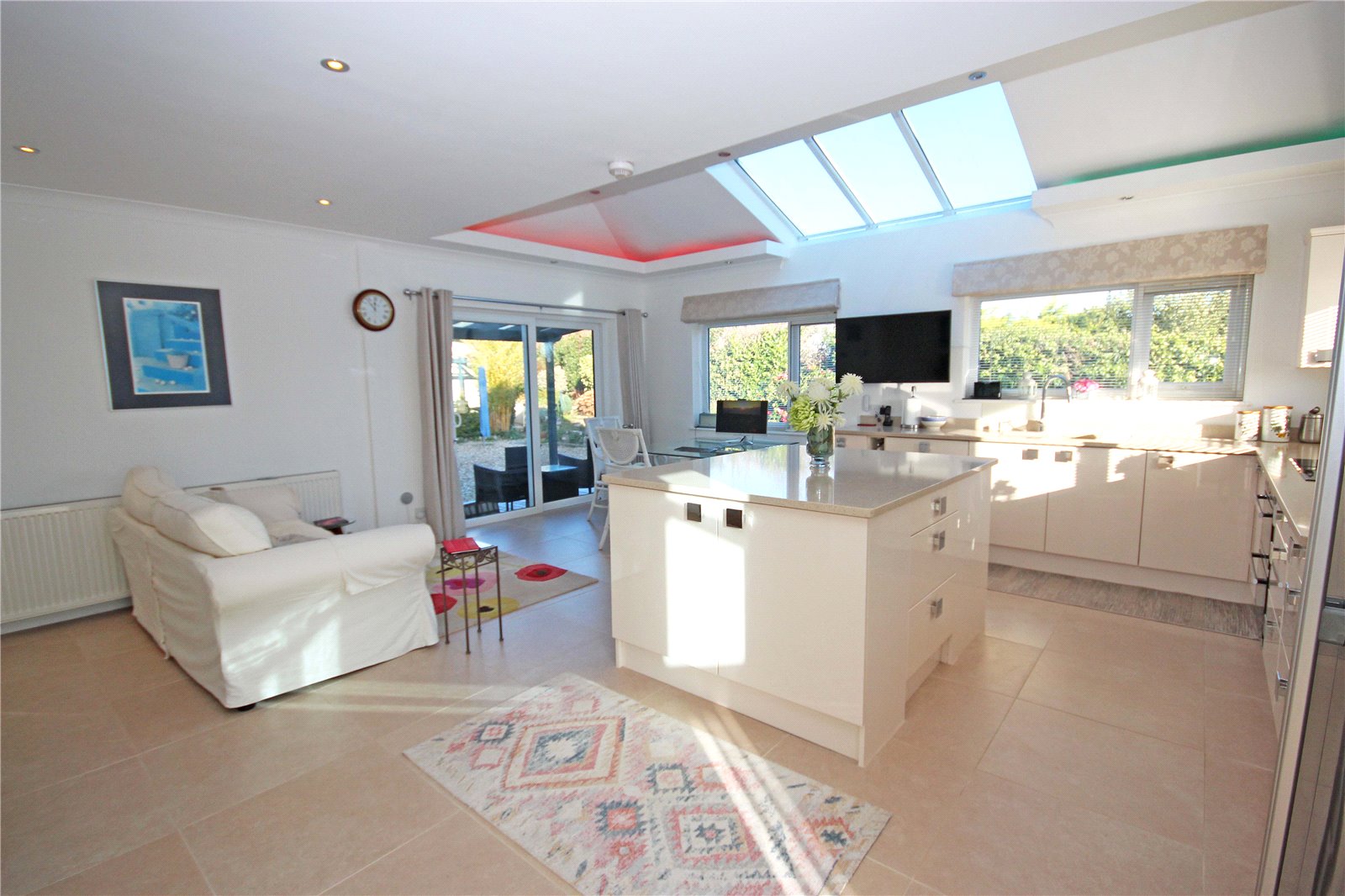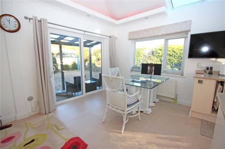 The sizeable kitchen diner has been extended by the current owners and benefits from a vaulted ceiling with glazed panels and electric remote-control blinds, as well as LED ambient lighting. This triple aspect room also has sliding patio doors leading out to a covered seating area flooding the space with natural light. There is a matching range of cream gloss base and wall units with Silestone worktops and several integrated appliances including a dishwasher, filtered water tap, double oven, electric hob and microwave as well as space for an American style fridge freezer. This kitchen also benefits from a large matching island with deep pan drawers all with soft close fittings, additional storage below, and power points. This spacious room creates a sociable area with space for a table and chairs and sofa perfect for family living or entertaining. There is also a large storage cupboard with space and plumbing for a washing machine, alongside a deep under stairs storage cupboard with extractor fan.