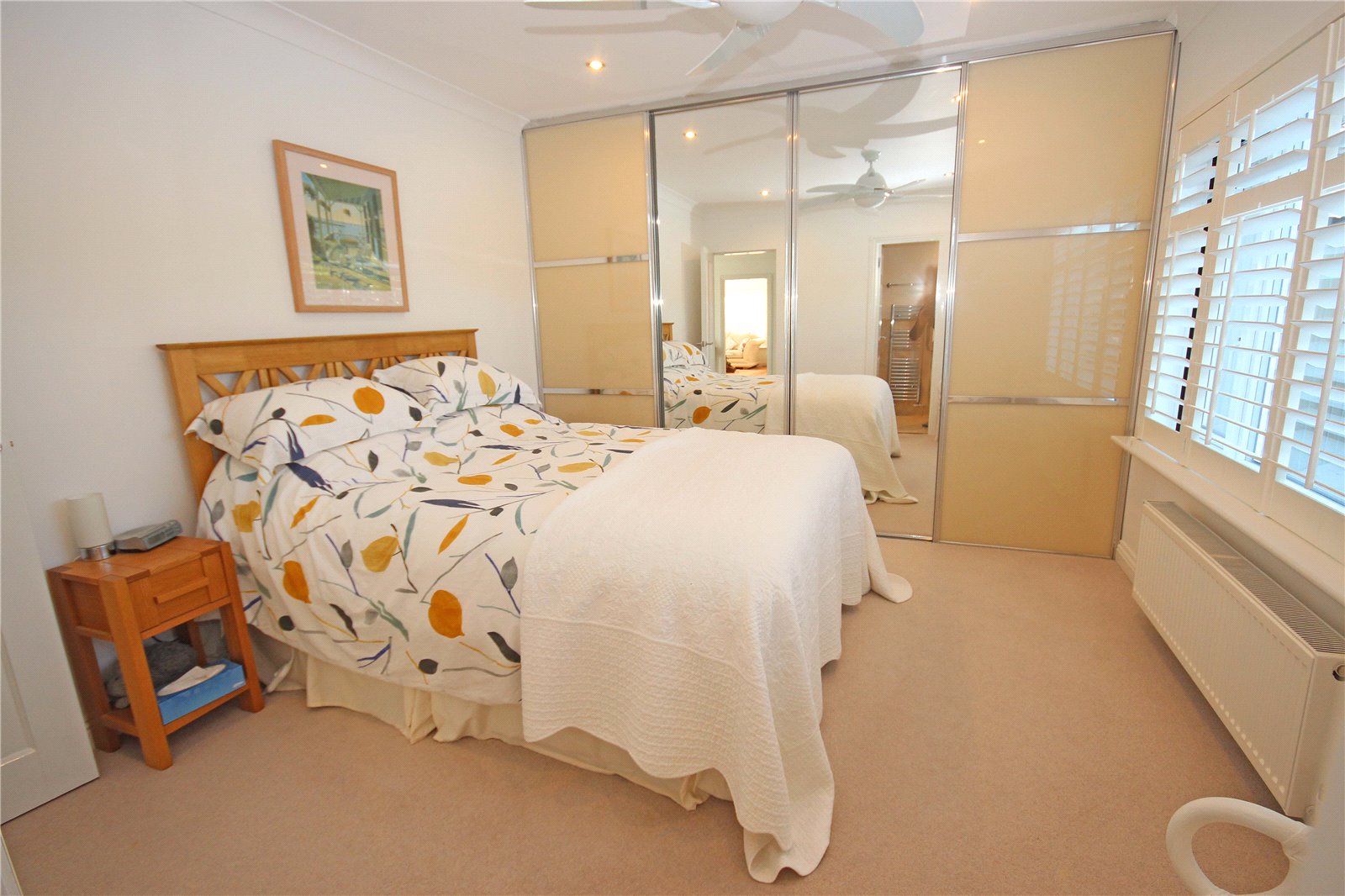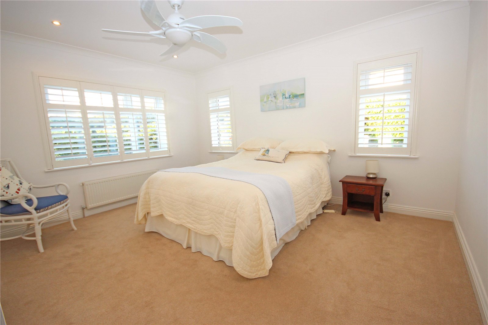 Bedroom Three is a spacious dual aspect double room with built in wardrobe with sliding doors and hanging space. Bedrooms two and three both benefit from remote controlled ceiling fans. Bedroom four is a smaller double room with built in wardrobe and picture window looking out to the front of the property.