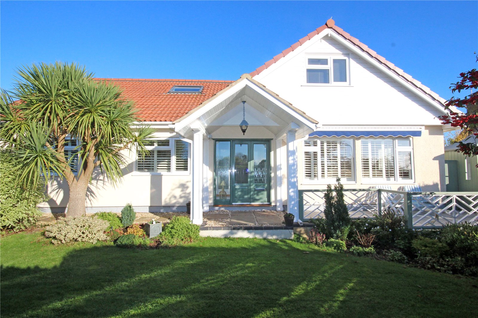 This timber framed property has a pretty exterior with a decorative wooden balustrade fronting the veranda shaded by an electric awning. A pathway leads up to a portico style porch with glazed apex. Dark green wooden double doors open into the entrance porch creating an area for muddy boots and coats, whilst a further large glazed door opens into the spacious hallway which benefits from a deep storage cupboard with hanging space.