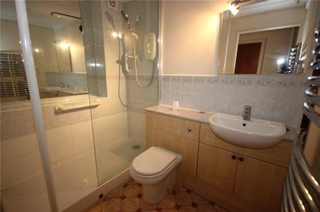 The shower room benefits from a modern suite including large walk in shower with handrail and large mirror alongside vanity unit with integrated wash hand basin and concealed cistern Wc.
