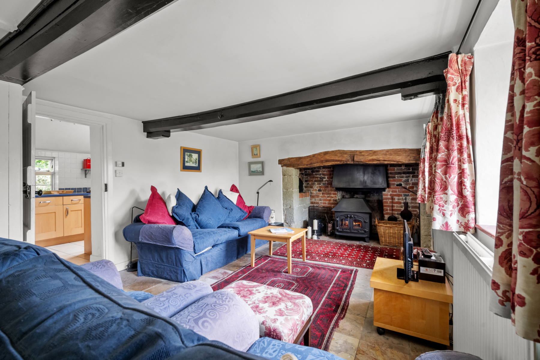 As you enter, you are welcomed by a characterful interior, where exposed beams and an original inglenook fireplace create a warm and inviting atmosphere. An entrance lobby leads to the KTICHEN in the extended part of the cottage. The kitchen offers ample storage and space for a fridge/freezer, washing machine, and a Belling stove. Off the lobby area is a downstairs BATHROOM which has a bath, W.C, separate shower cubicle and hand basin.