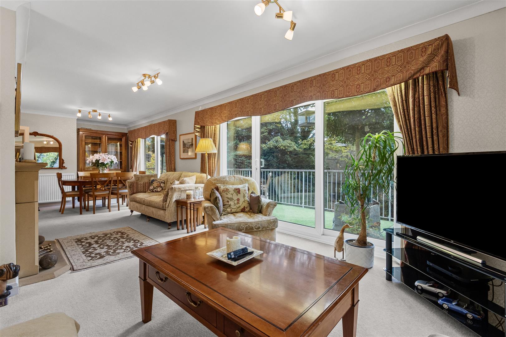 - Spacious open-plan living and dining room with balcony overlooking the lake