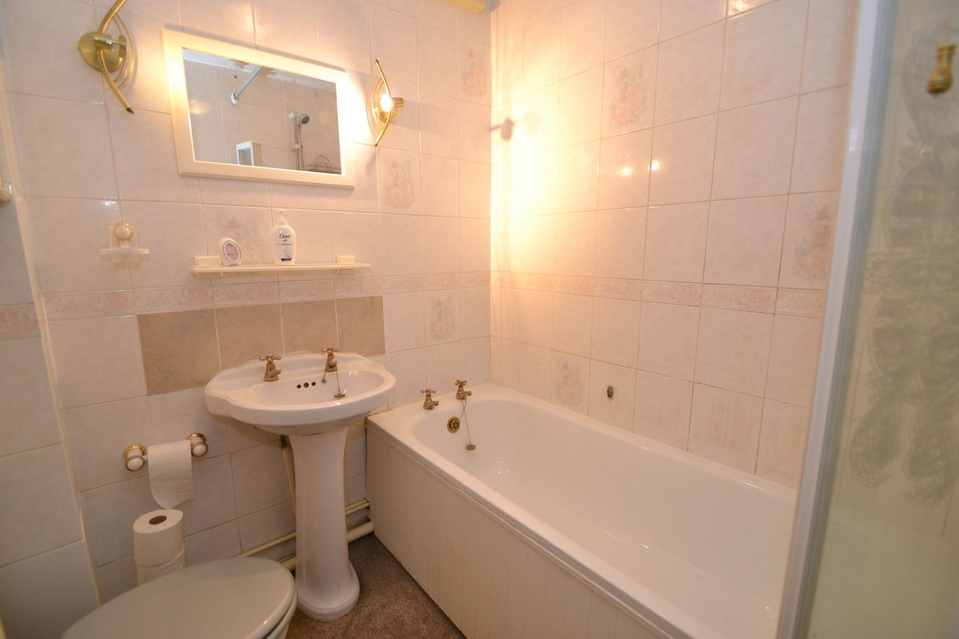 Bathroom: Three piece suite in white, fully tiled, fold back shower screen, electric shower over the bath, extractor, radiator.
