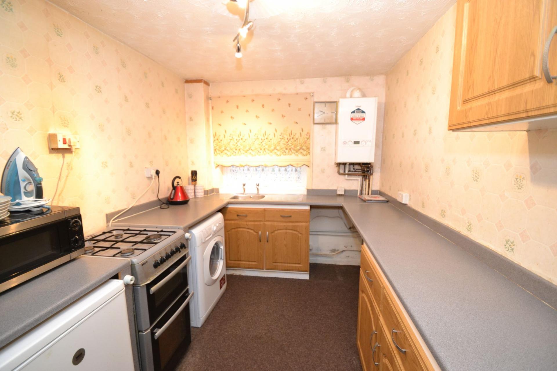 Kitchen: 3.6m x 2.3m (11'8 x 7'5). Range of wall & base units in oak, work tops, wall mounted Ideal Logic C30 Condensing boiler, stainless steel sink, plumbed for an auto-washer, space for a fridge and freezer, plumbed for a dishwasher.