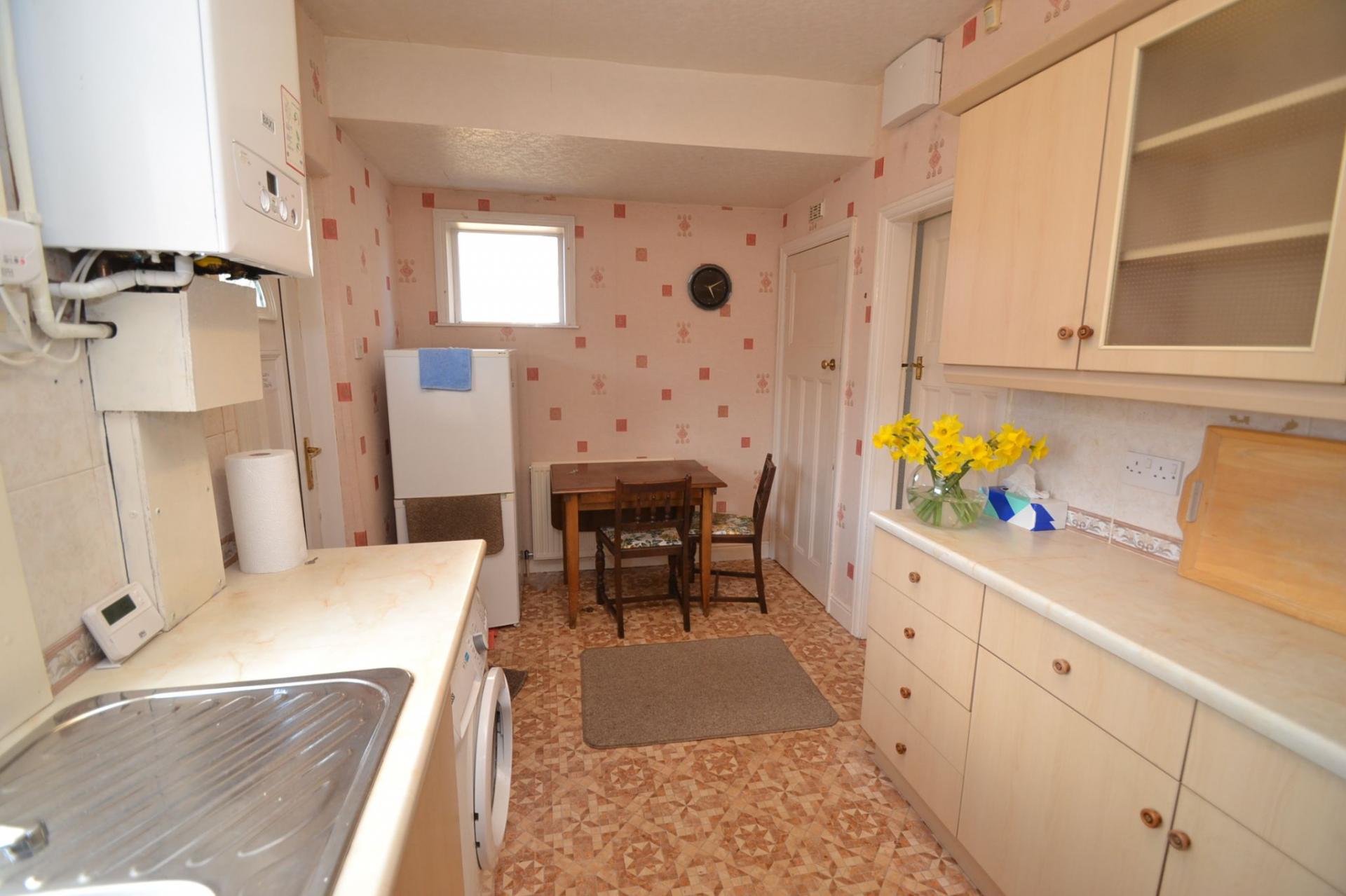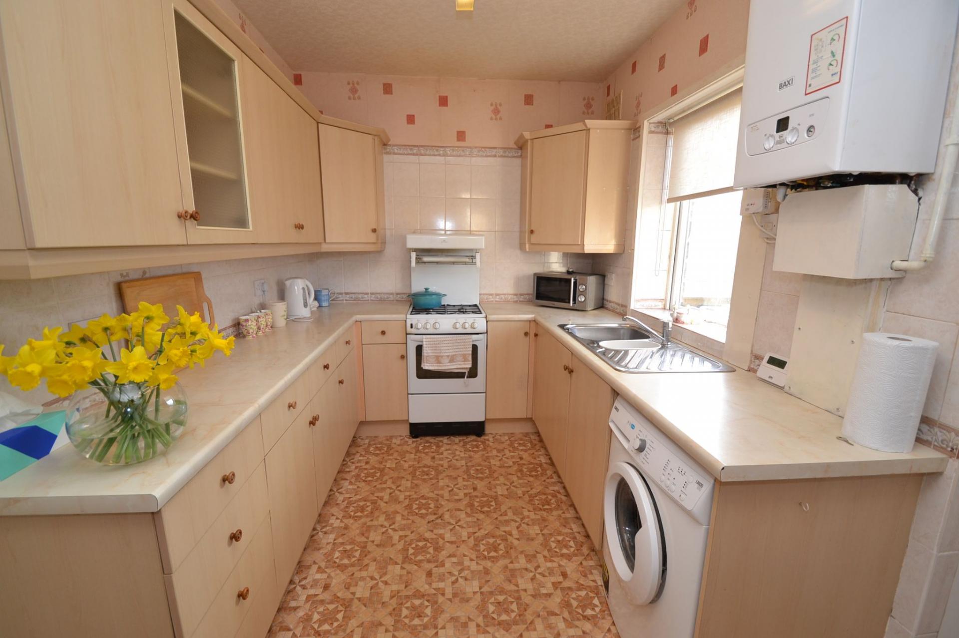 Kitchen: 4.65m x 2.29m (15'2 x 7'5). Range of wall & base units in maple, work tops with tiling above, piped for a gas cooker, plumbed for an auto-washer, stainless steel 1.5 sink, radiator, Baxi condensing boiler, Upvc dg window to side & rear, Upvc entrance door to rear, space for a small table and chairs, pantry cupboard.