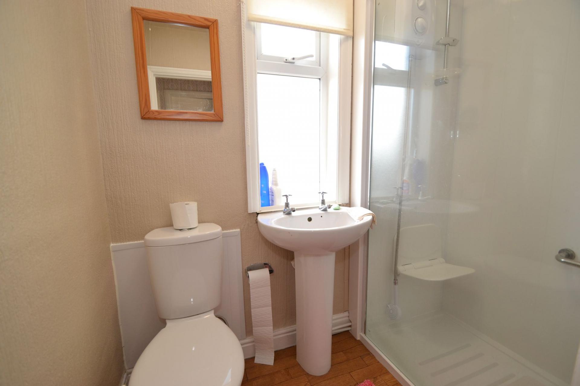 Shower Room: 1.94m x 1.82m (6'3 x 5'9). Walk in shower cubicle with a part glass screen, electric shower unit, wash basin and wc in white, frosted Upvc dg window, radiator.