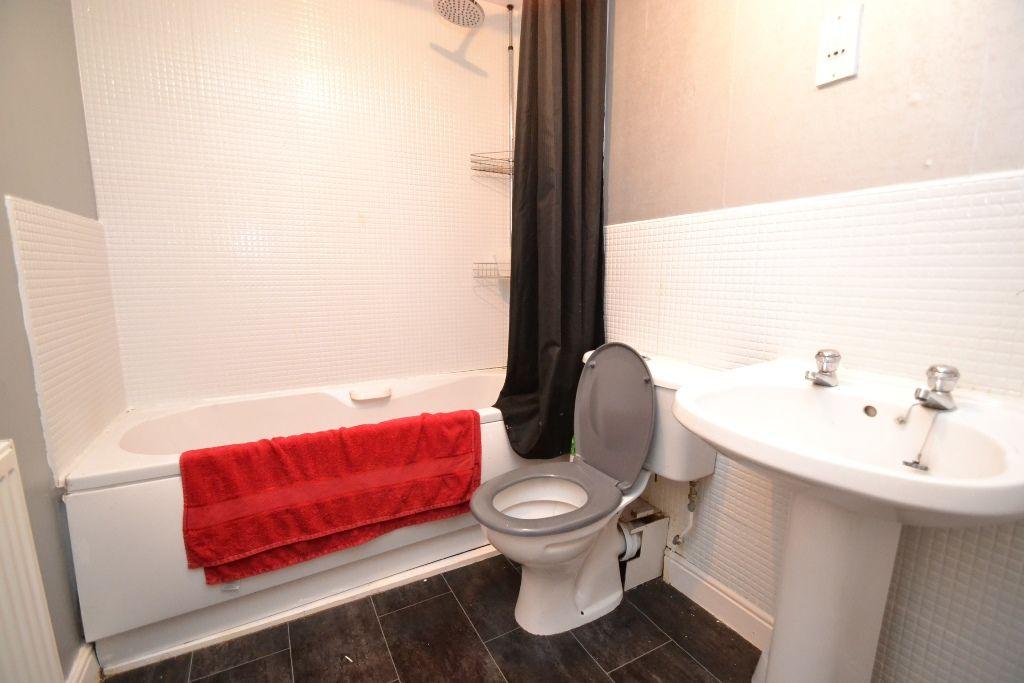 BATHROOM: Family sized bathroom in white with splash back tiling, comprising of bath with shower over, white low flush WC and white wash basin, ch radiator, frosted Upvc dg window.