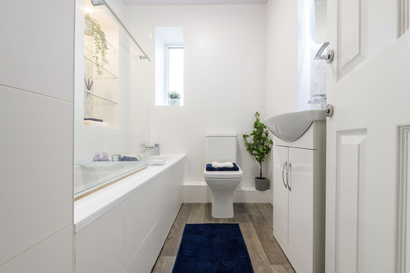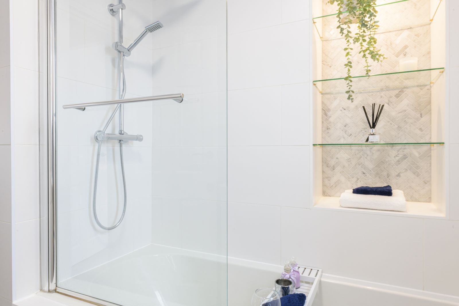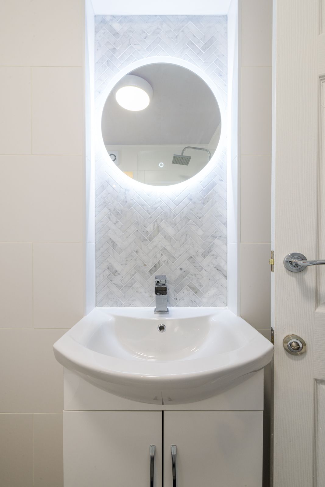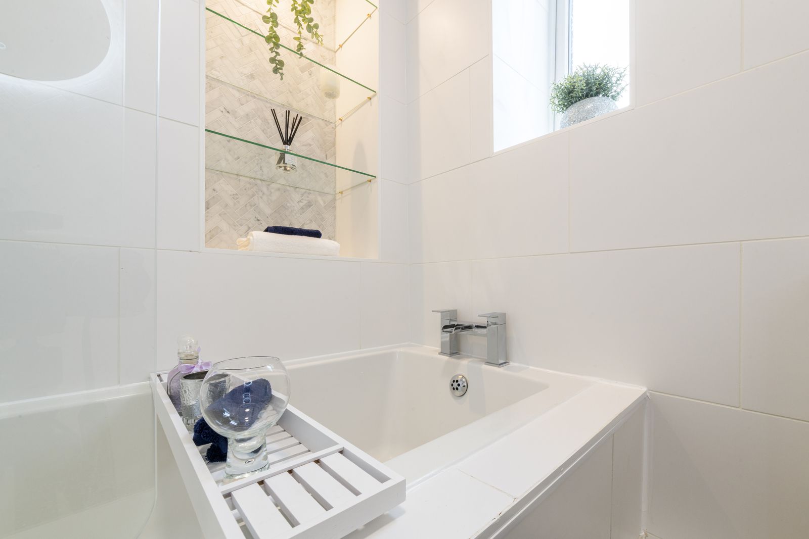 Bathroom: 1.96m x 1.78m (6'5 x 5'10). Three piece suite in white, chrome fittings, fully tiled, shower screen with chrome thermostatically controlled shower unit over the bath, wash basin set on a white high gloss vanity unity, frosted Upvc dg window, heated chrome towel rail, extractor, touch led vanity mirror with heribone mosaic calacatta marble tiles.
