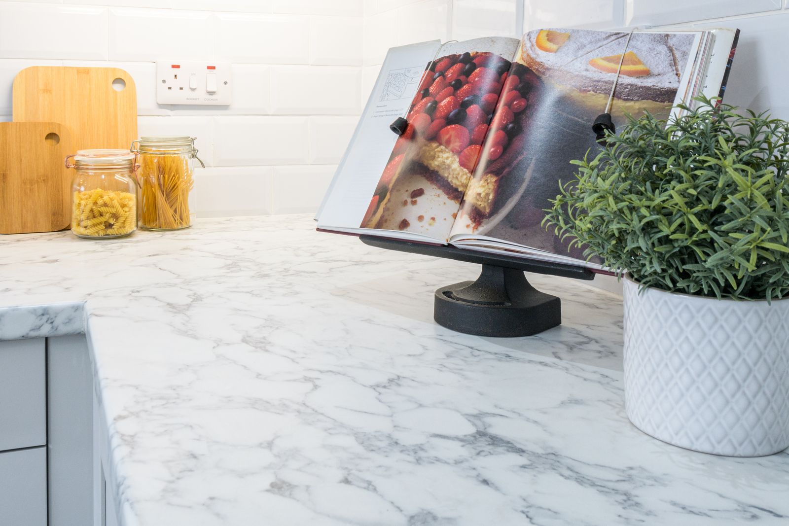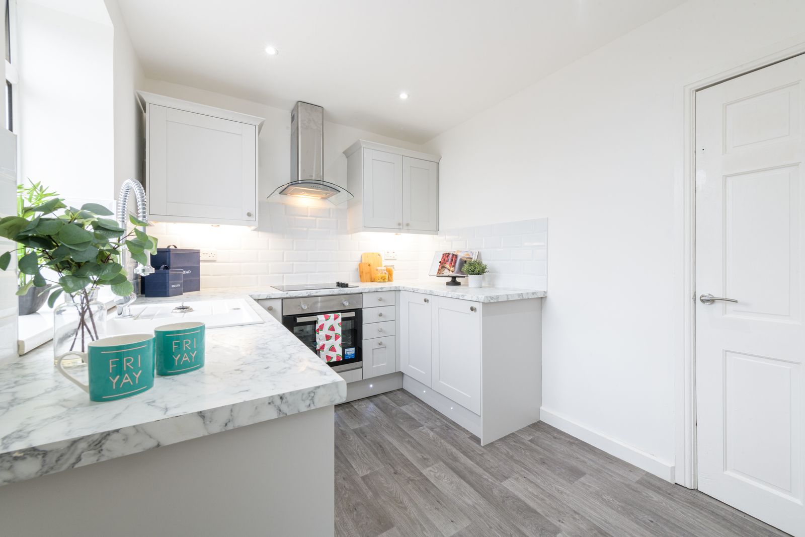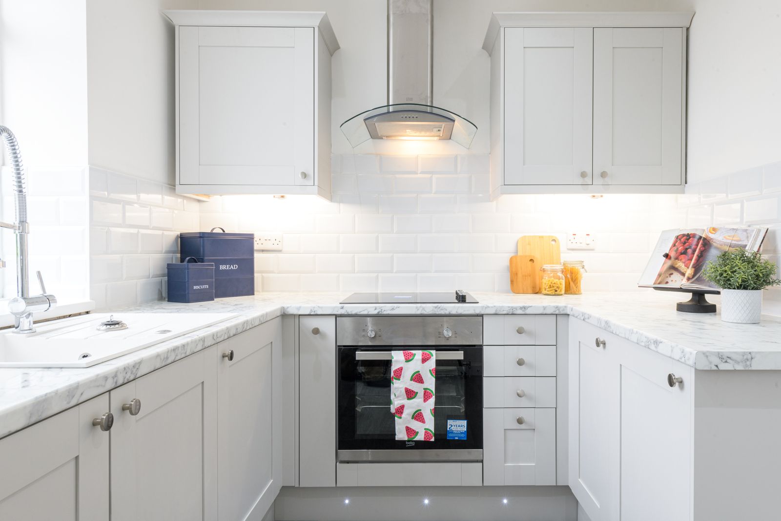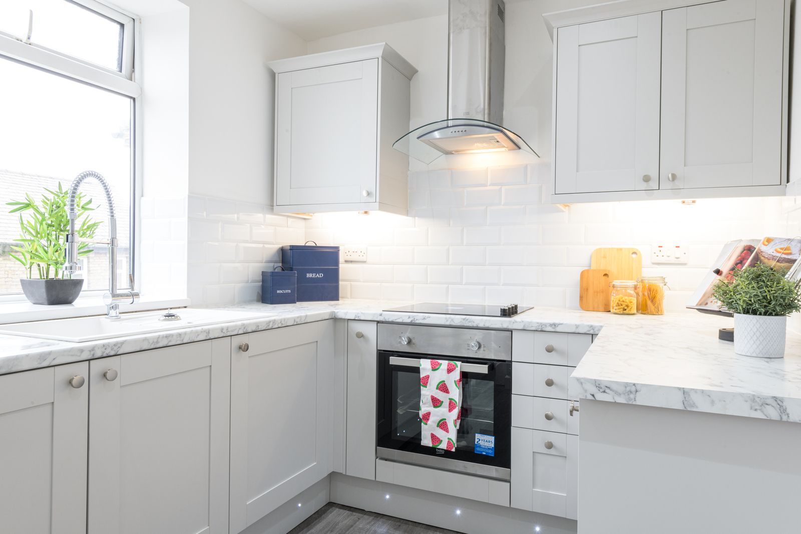 Kitchen: 4.01m x 2.36m (13'1 x 7'8). Range of modern wall & base units with soft close hinges, work tops with white brick effect tiling above, under lighting, stainless steel extractor hood over a 4 ring halogen ceramic hob, built in electric oven in stainless steel, space for a tall boy fridge freezer, Upvc dg window to rear, composite garnite effect sink in white with extendable chrome tap, integrated auto-washer dryer, inset ceilling lights, radiator, plinth LED lighting in blue, rear Upvc dg door.