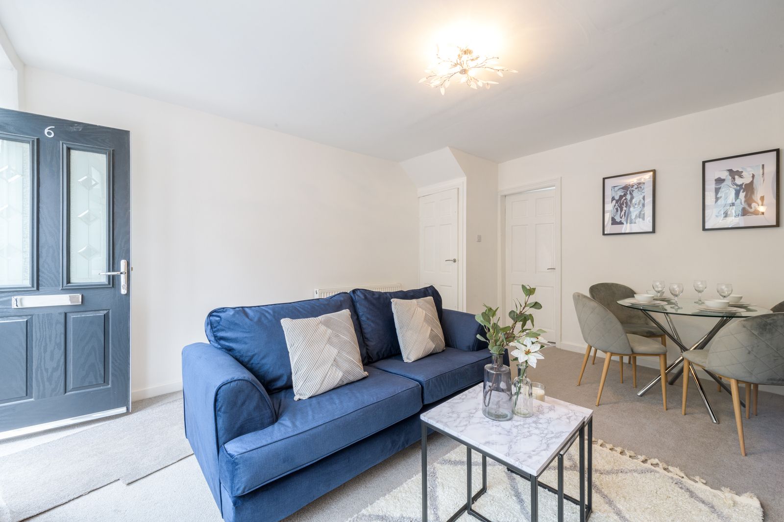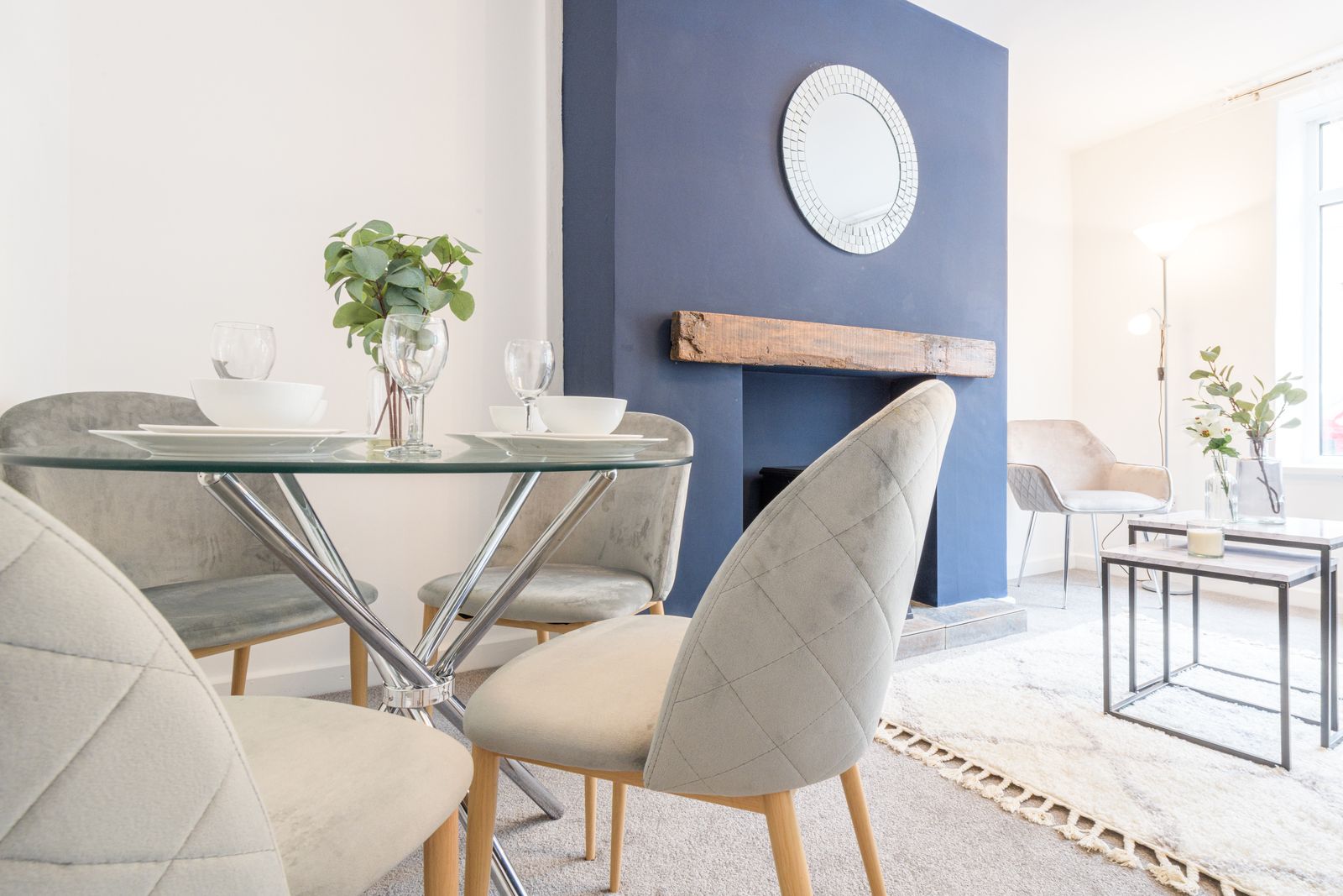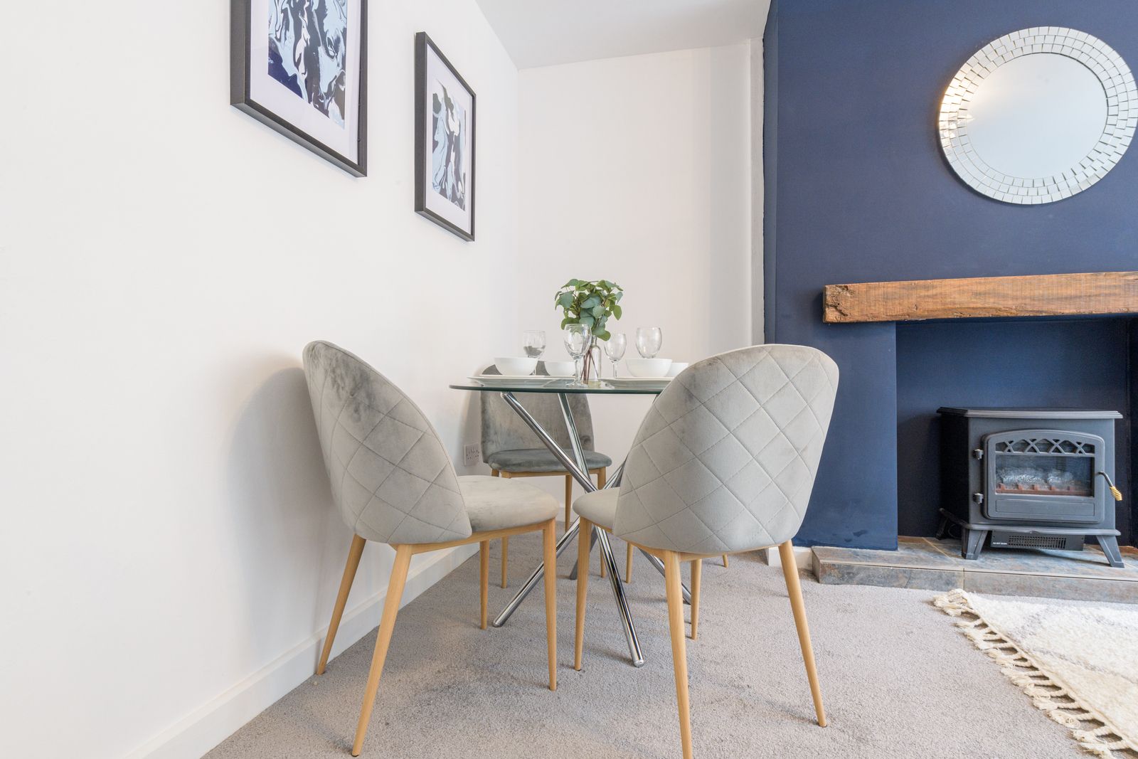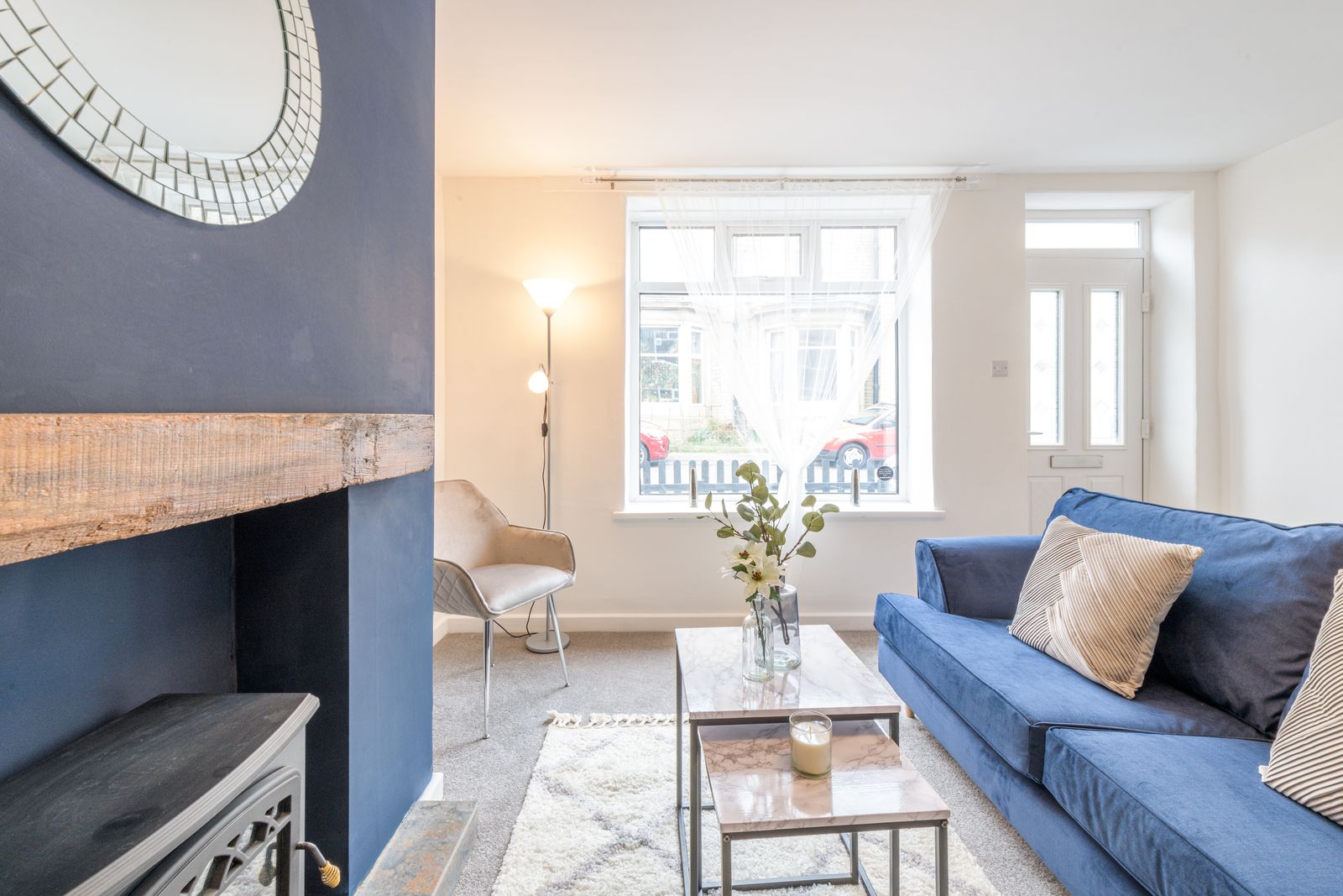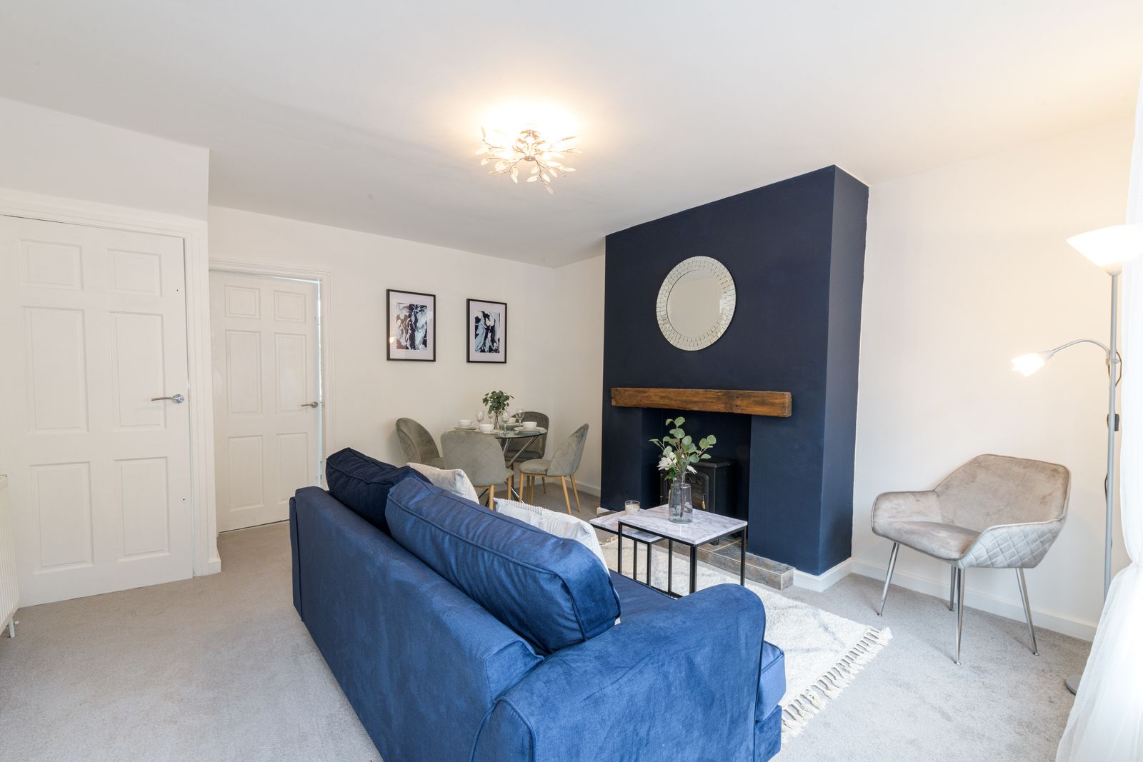Lounge: 4.42m x 4.10m (14'6 x 13'5). Front composite door, Upvc dg window to front, radiator, feature chimney breast with oak lintel and tiled hearth along with an electric wood burner stove, space for a table and chairs.