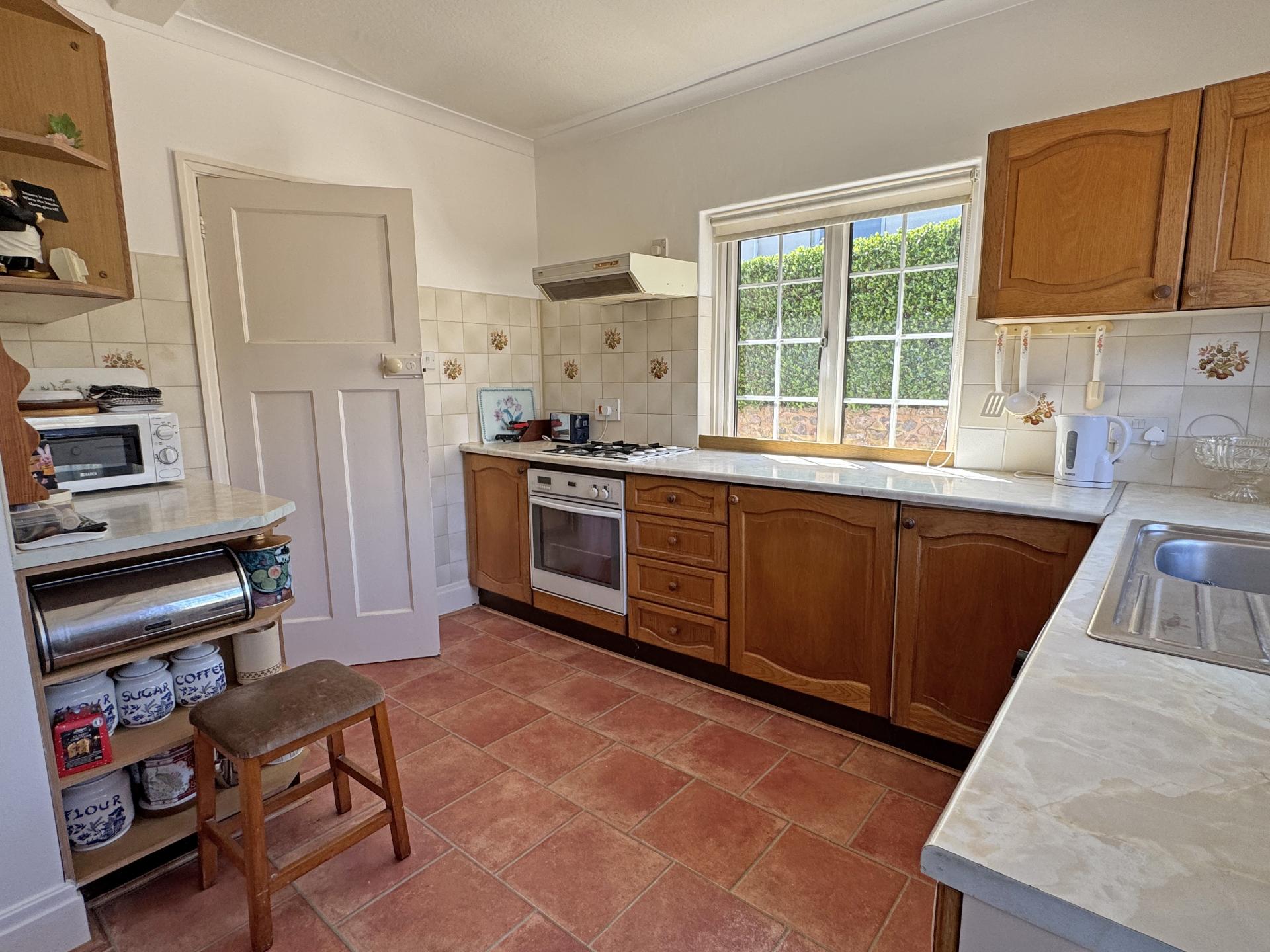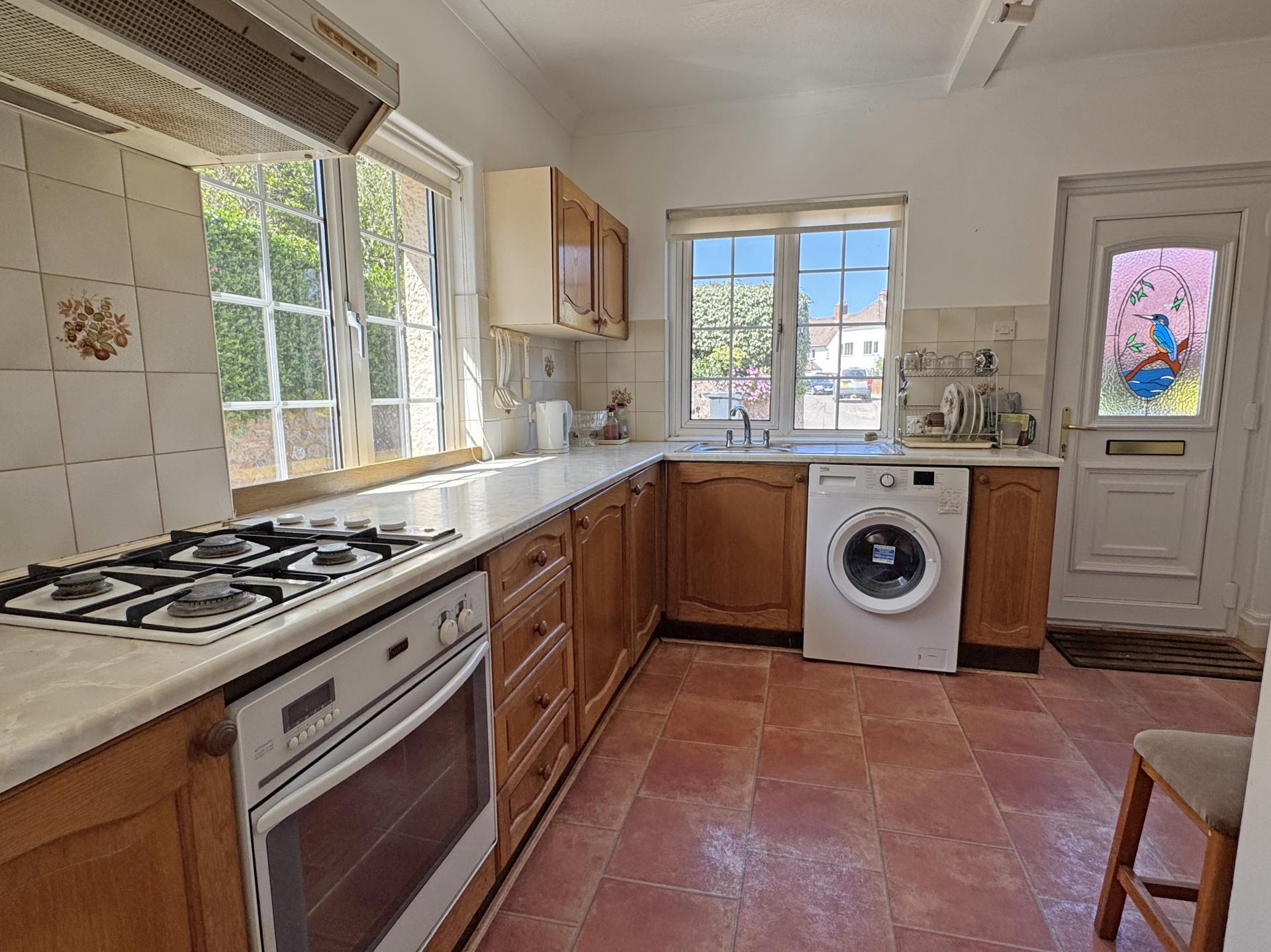 On entering the bungalow, the reception hall has a cloaks cupboard along with an airing cupboard. The sitting room enjoys a triple aspect, having a fireplace with gas fire and central French doors leading into a uPVC double glazed conservatory which enjoys a lovely outlook over the garden and opens onto a paved terrace. The kitchen is to the front of the bungalow and gives access to the front driveway and has a dual aspect. A range of cupboards and worksurfaces provide storage and there is a built-in electric oven, gas hob, cooker hood, along with space for a fridge/freezer and washing machine.
