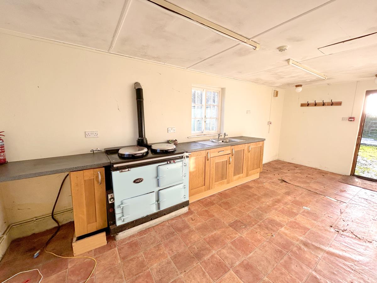 Kitchen - 6.06 x 2.54 (19'10" x 8'3") - A wood effect kitchen with stone effect worktop that incorporates a stainless steel sink drainer. There is a pale blue Aga (not tested). The room has windows both to the side and rear aspect and there is a door to the front.