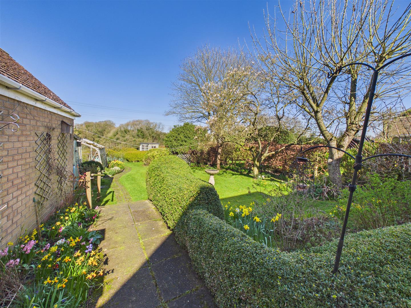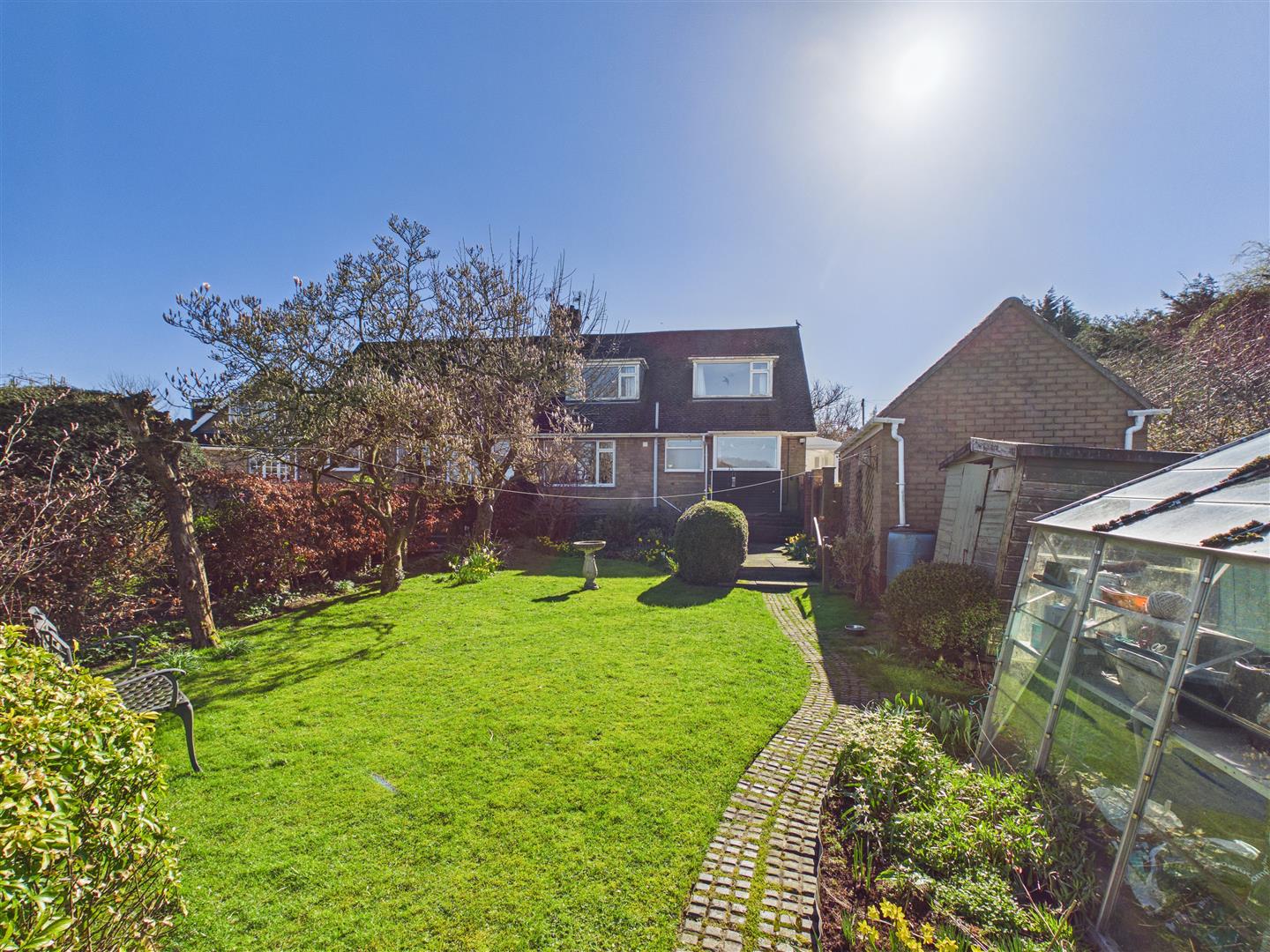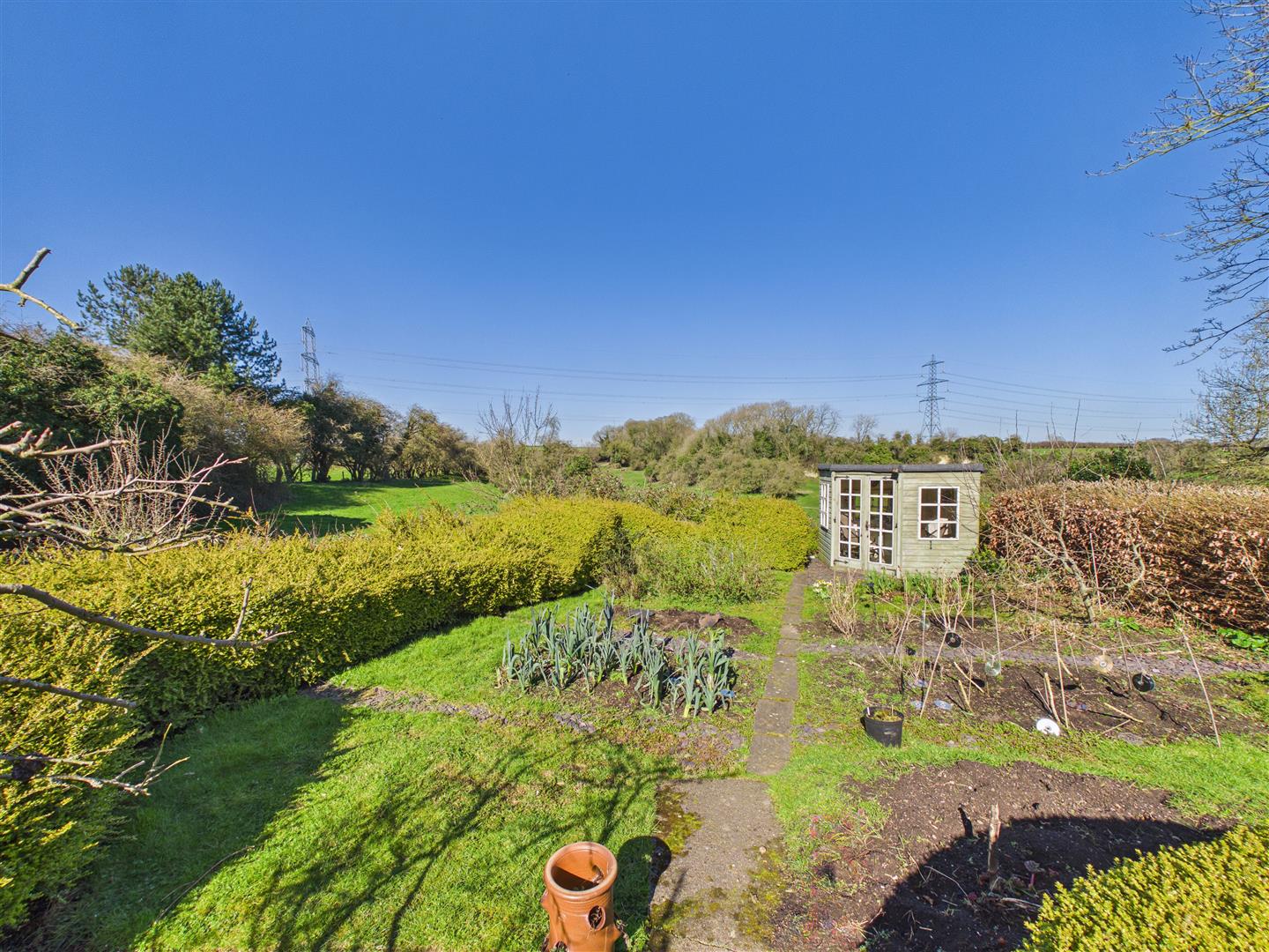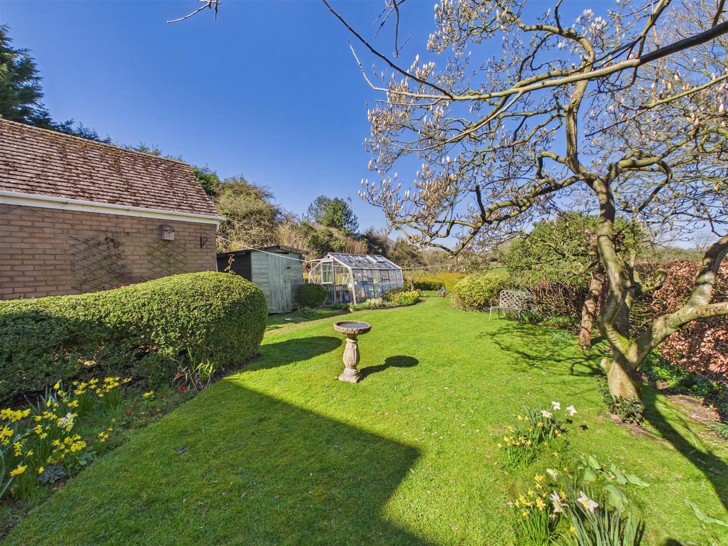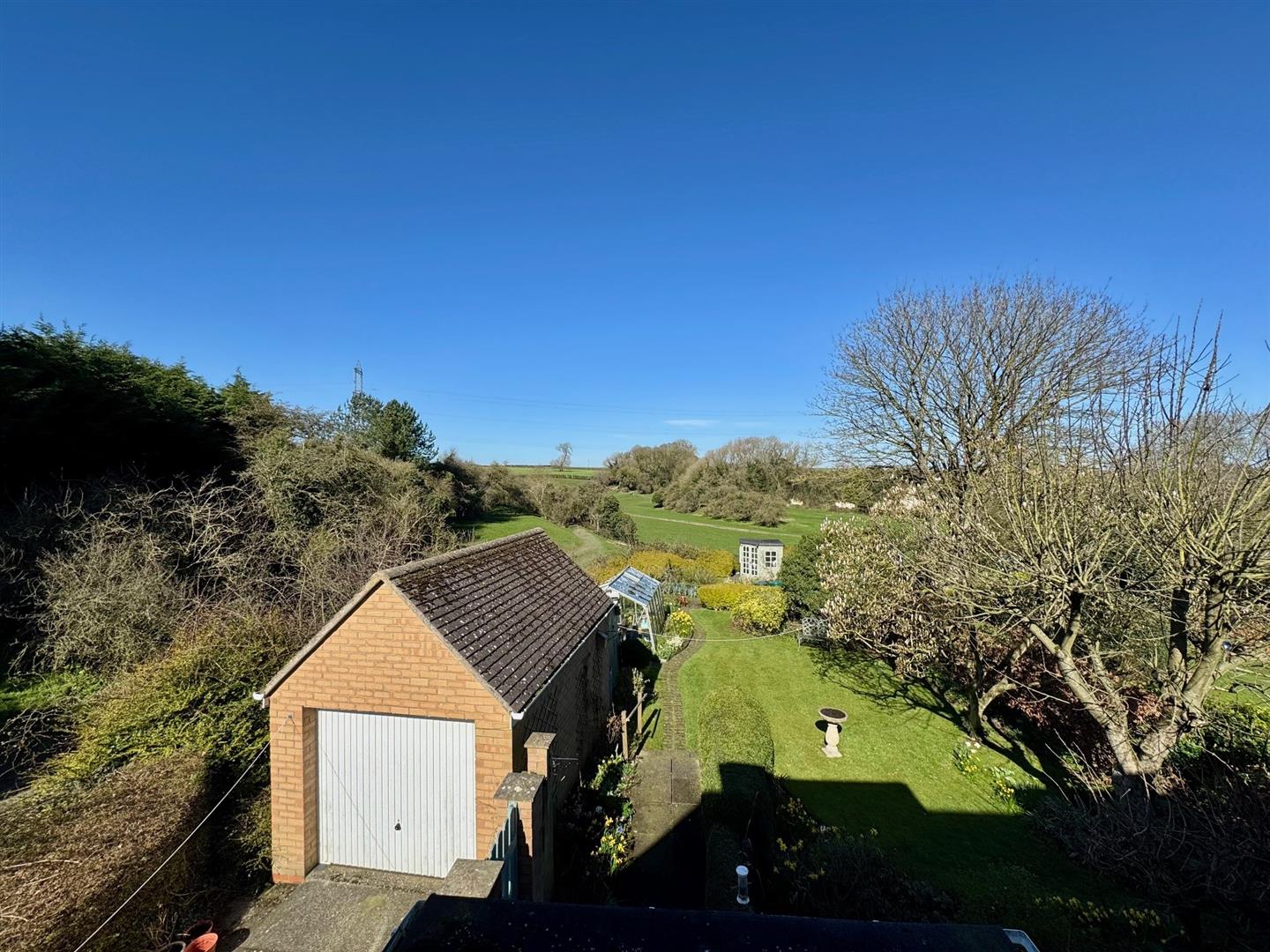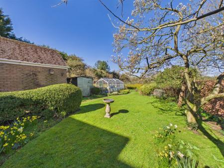 Outside - An attractive ornamental garden with curved low brick wall with raised borders being well stocked and with box hedging to the front. With many areas of interest, the rear garden has a beautiful aspect to the rear across the rolling landscape. Features include patio areas, shaped lawn and well stocked borders together with veg patch, greenhouse, shed and summerhouse to the far corner. A side drive provides access to the brick and pitched tiled roof garage.