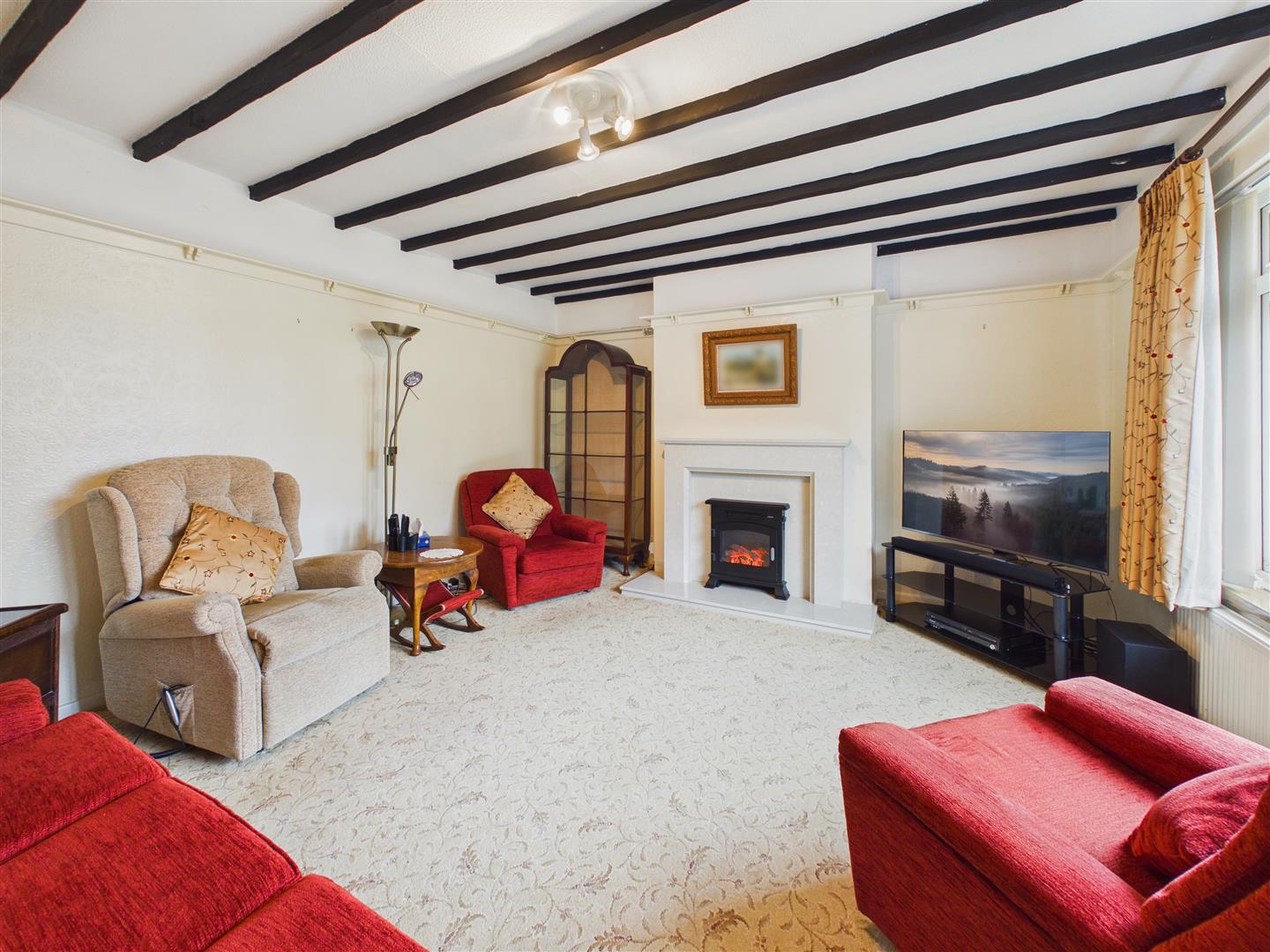 Lounge - A lovely lounge with decorative beams to ceiling, picture window to front, feature marble fire surround with electric fire, delft rack to walls.