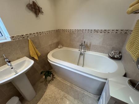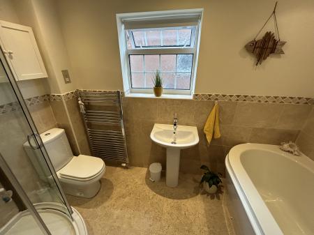 FAMILY BATHROOM/WC WITH SHOWER CUBICLE An attractive four piece fitted suite with shower cubicle, feature oval bath, wash hand basin and wc. Feature tiling.