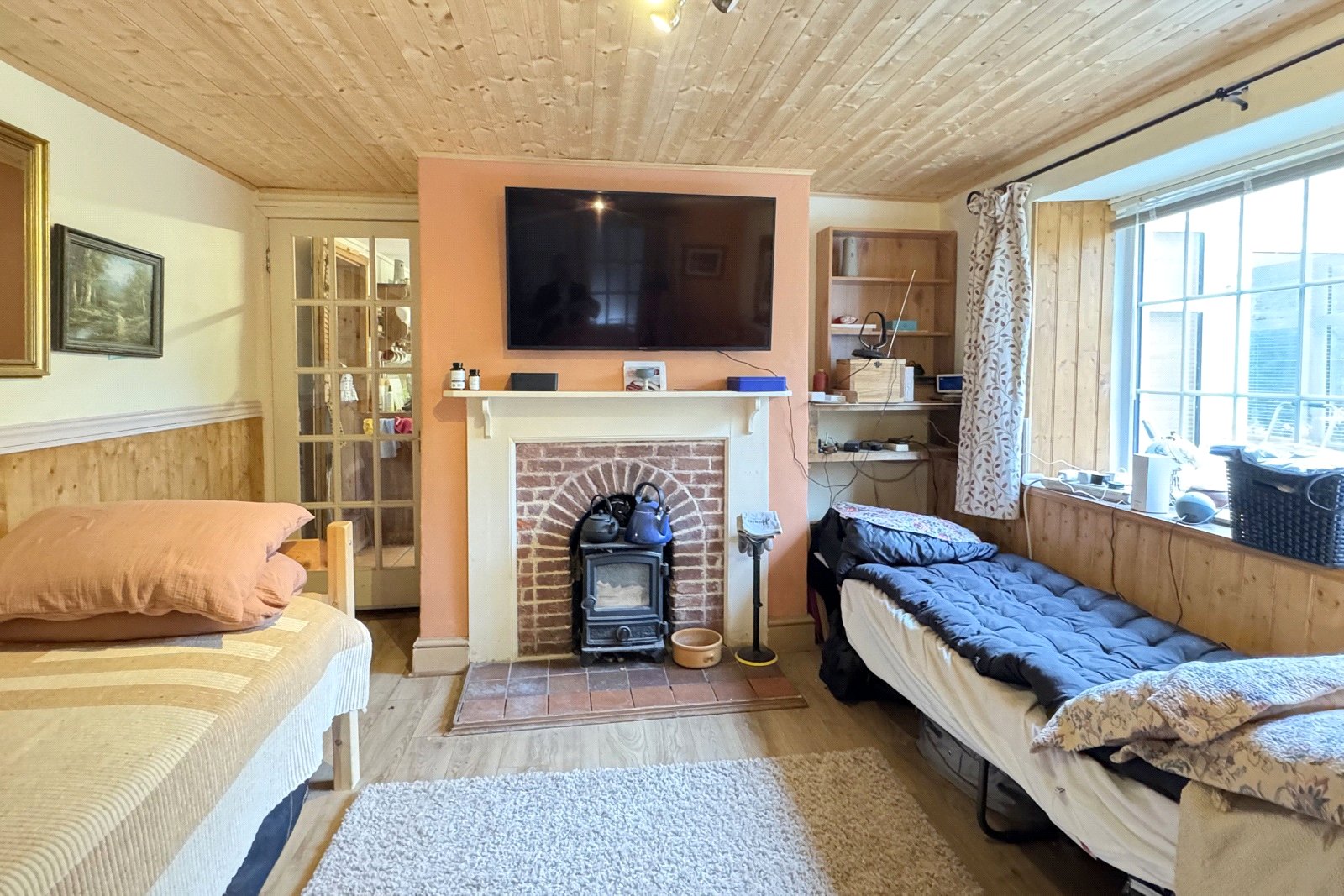 BEDROOM 1: 11’3” x 11’9” (max) A characterful room with a period cast iron fireplace, exposed timbers, double glazed windows to front aspect, radiator and fitted single wardrobe.
