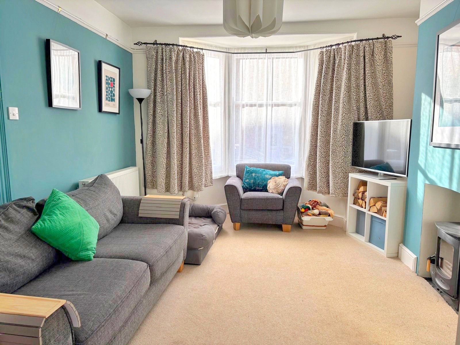 The majority of the accommodation is arranged on the ground floor and includes an entrance hall, a bright sitting room with bow window, two double bedrooms, a wet room, and a kitchen overlooking the rear garden.