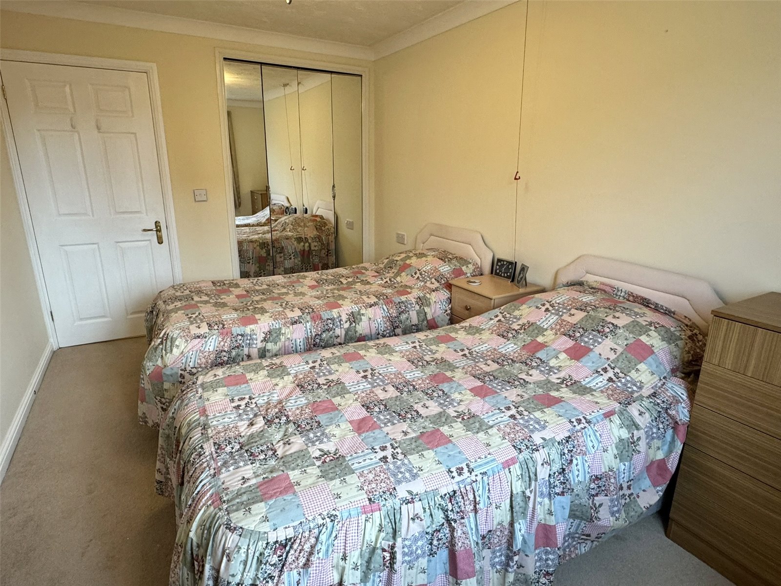 Bedroom 13'4" (4.07m) x 8'11" (2.73m) excluding wardrobe. Built-in storage cupboard with mirror fronted folding doors. Electric night storage heater and double glazed window to the front aspect.