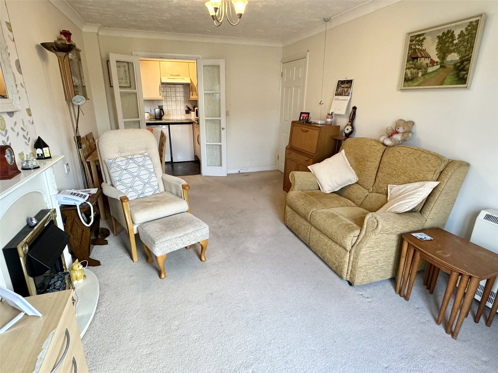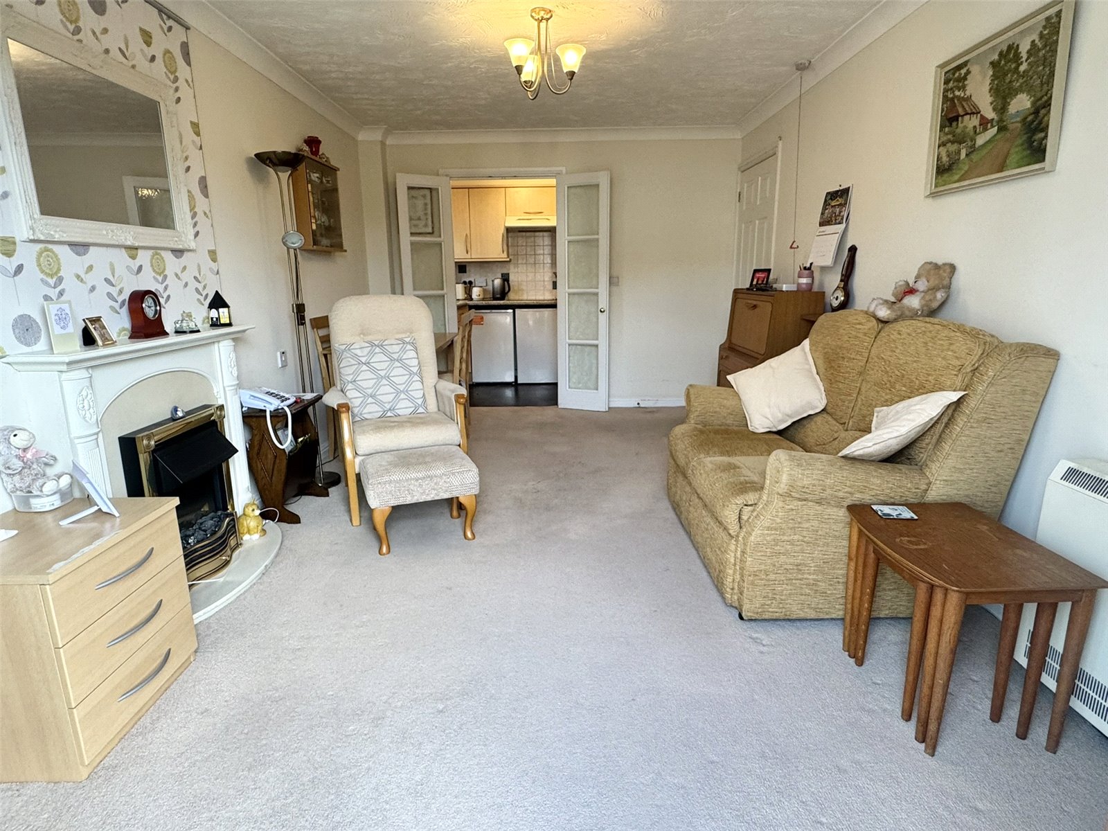 Lounge 16'9" x 10'2" (5.1m x 3.1m). Wall mounted electric night storage heater, television point, telephone point. Feature fireplace with inset electric fire. Double glazed door with side window out to communal front garden. Wooden opaque glazed double doors into kitchen.