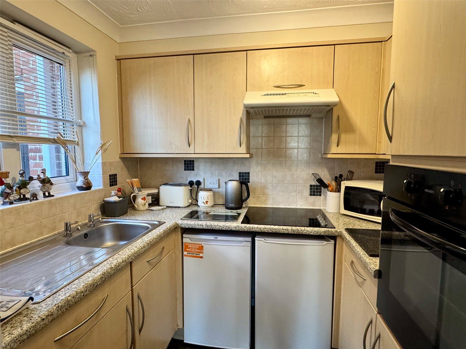 Kitchen 7'5" x 5'9" (2.26m x 1.75m). Fitted with a range of matching wall and base units set beneath worktops with inset sink and drainer. Inset elevated electric oven, inset electric hob with hood over. Space for base fridge and freezer. Wall mounted electric fan heater. Double glazed window to the side aspect.