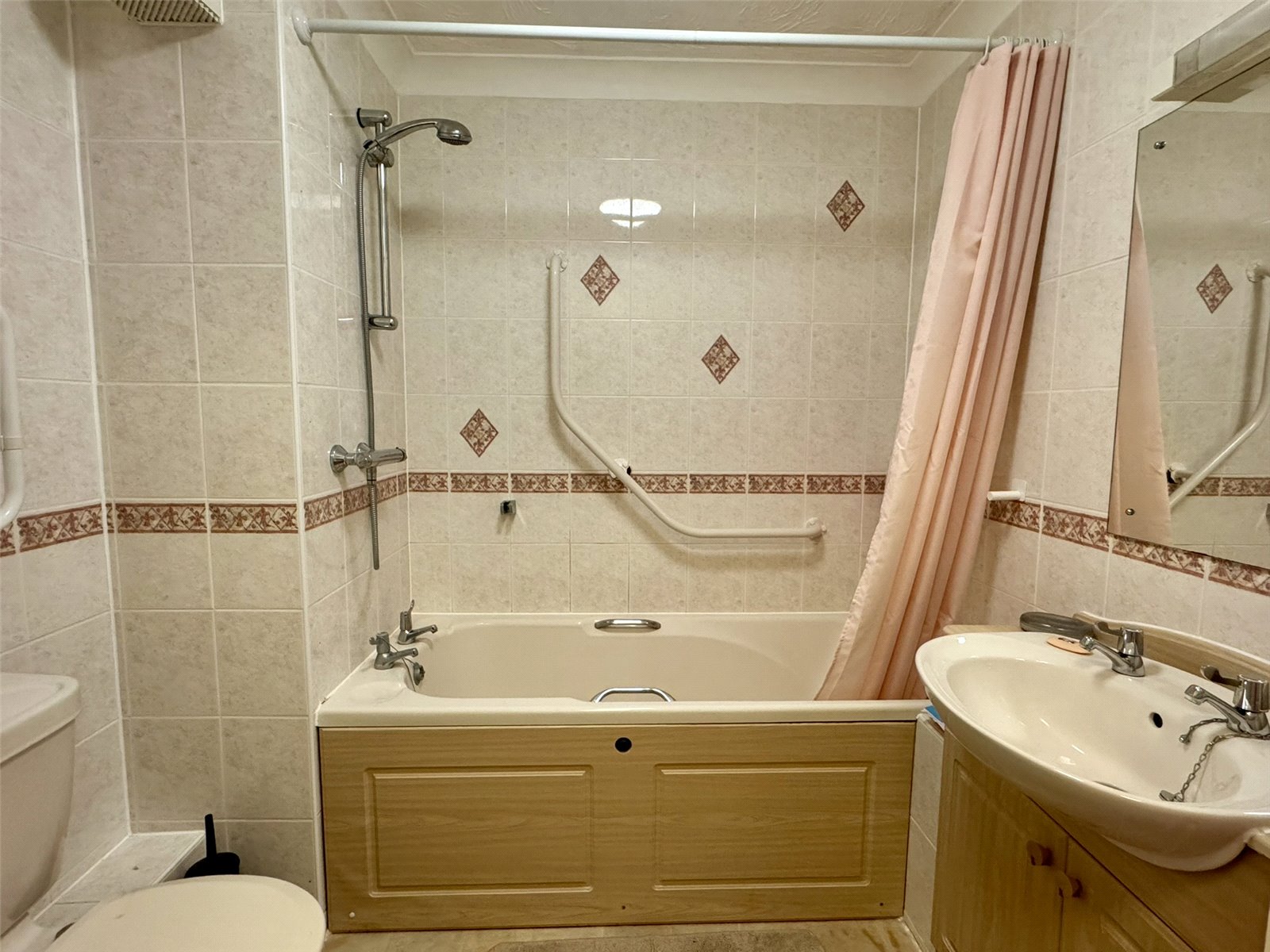 Bathroom Fitted with a three-piece suite comprising panelled bath with mains shower over, inset wash hand basin with vanity unit under, low-level W.C. Extractor, electric heated towel rail and wall mounted electric fan heater.