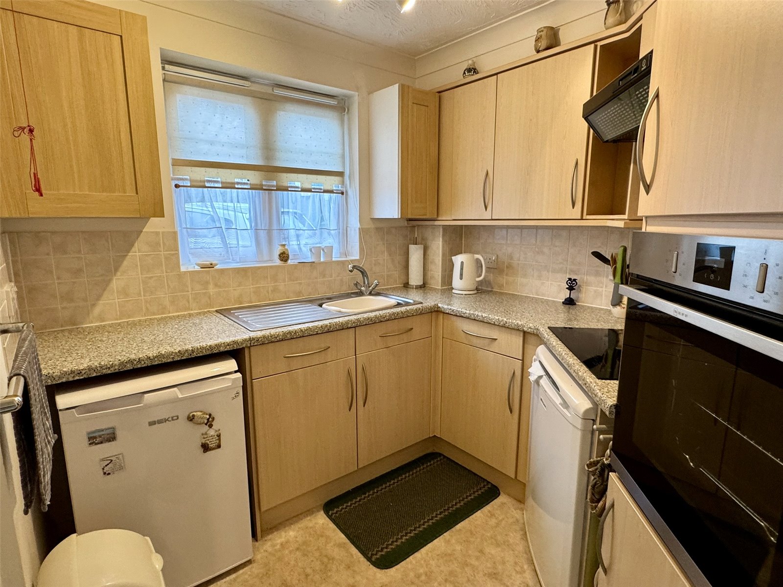 Kitchen 7'7" (2.32m) x 7'3" (2.22m) narrowing to 4'8" (1.43m) irregular shape. Wall and base units set beneath worktops with inset sink and drainer. Inset elevated oven, space for base fridge and freezer. Inset electric hob with hood over. Wall mounted electric fan heater. Double glazed window to the rear aspect.