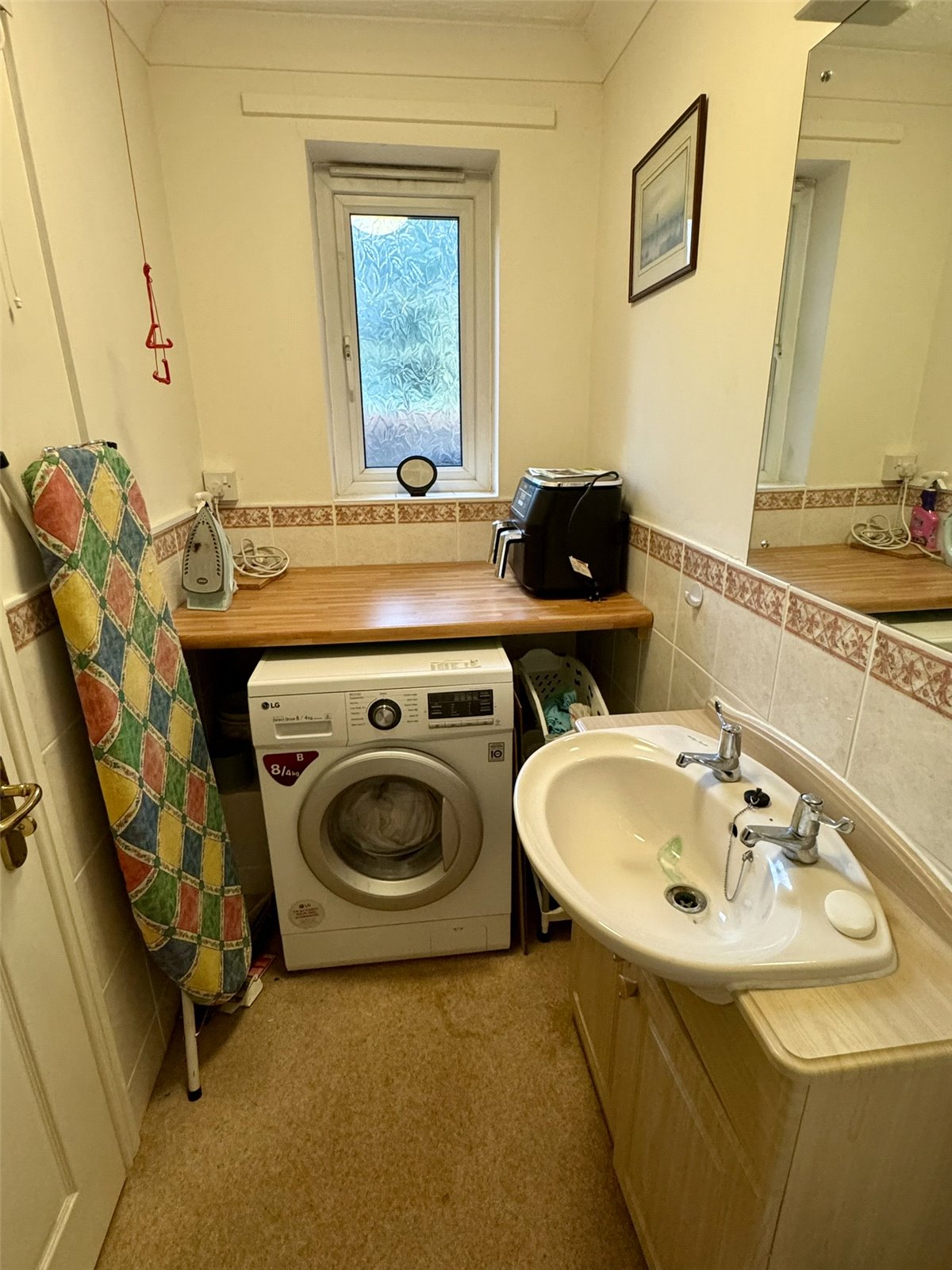 Utility Room 7'5" x 4'1" (2.26m x 1.24m). Wall mounted wash hand basin with vanity unit under. Space and plumbing for washing machine. Wall mounted electric fan heater, electric heated towel rail. Built-in storage cupboard. Opaque double glazed window to the side aspect.