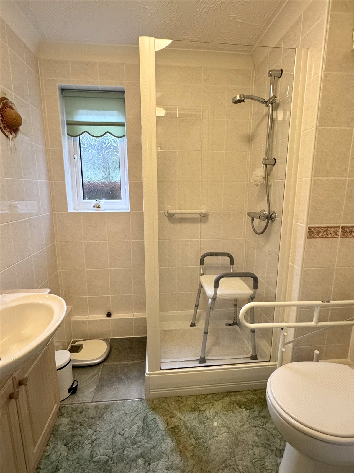 Shower Room Fitted with a three-piece suite comprising shower cubicle with mains shower, low-level W.C and inset wash hand basin with vanity unit under. Tiled splashbacks, wall mounted electric fan heater, electric heated towel rail and opaque double glazed window to the side aspect.