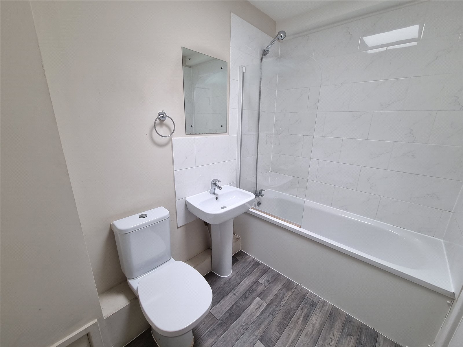 Bathroom    Benefiting a three piece suite consisting of a panelled bath, pedestal wash hand basin and low level W.C. Ceramic tiled splash backs, inset spotlights and skylight.