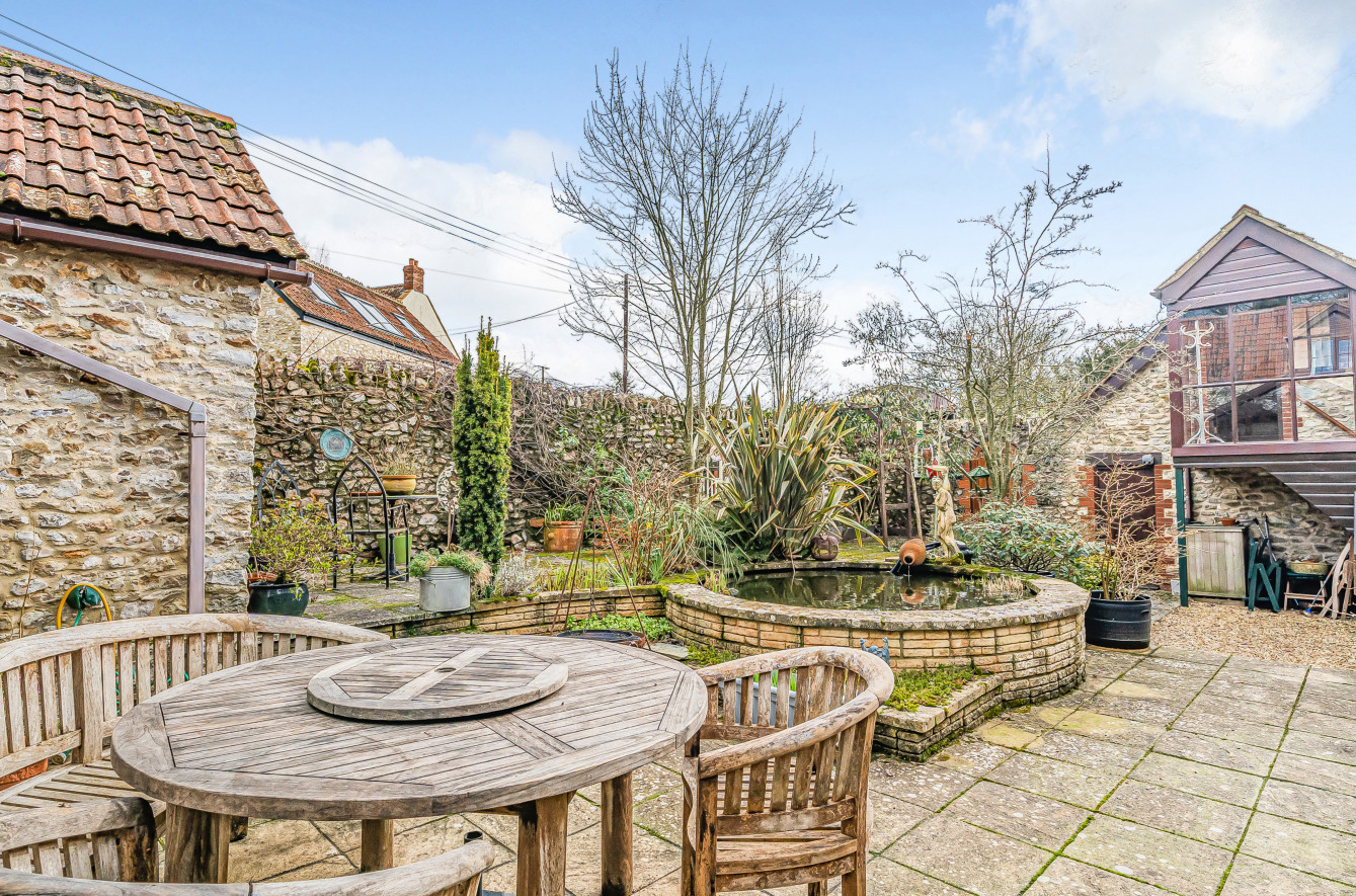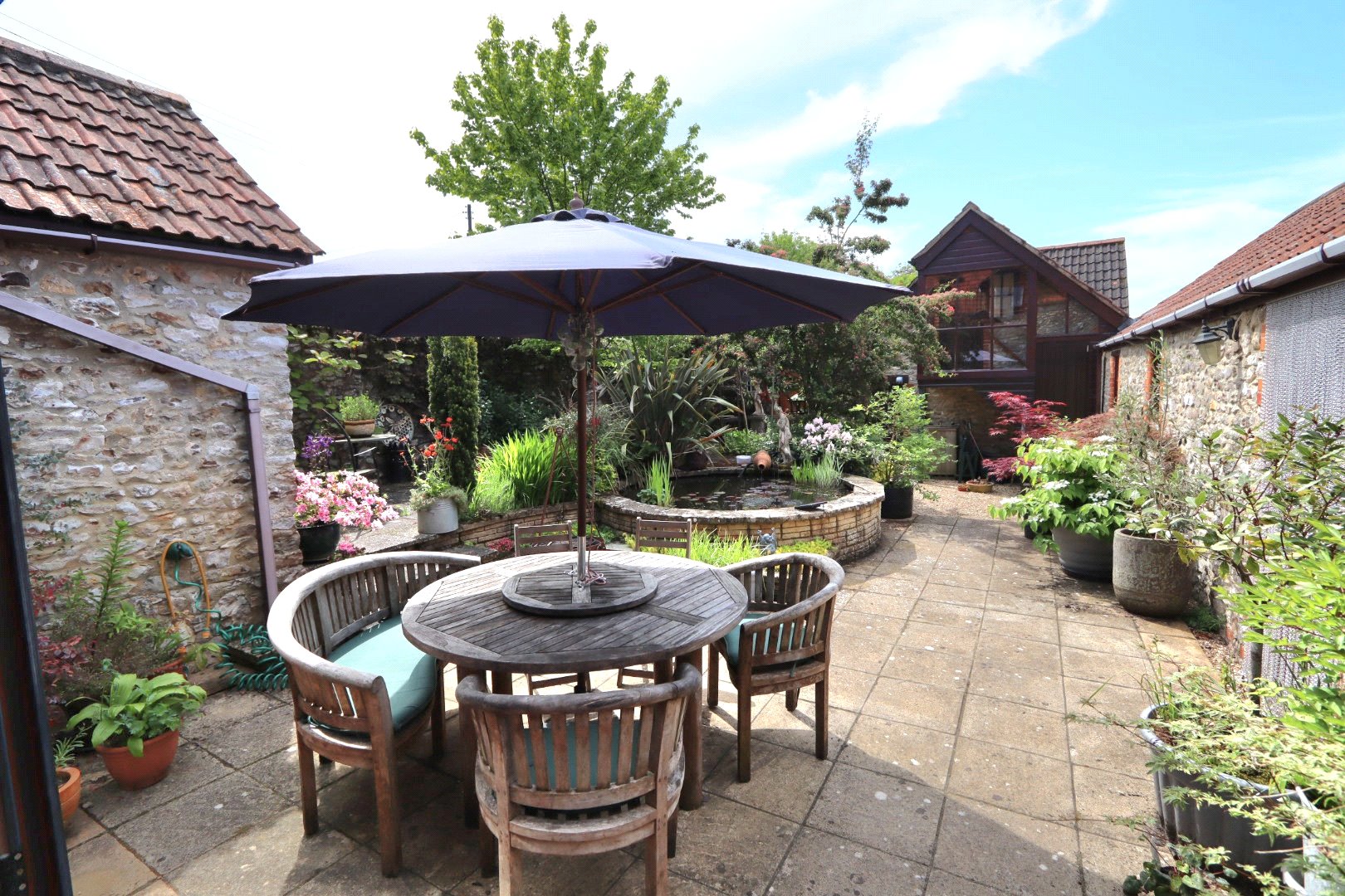 Adding to the charm, an additional enclosed patio courtyard garden basks in the morning sun, accessible from the garden room, sitting room, integral annexe, and the guest bedroom located above the garage.