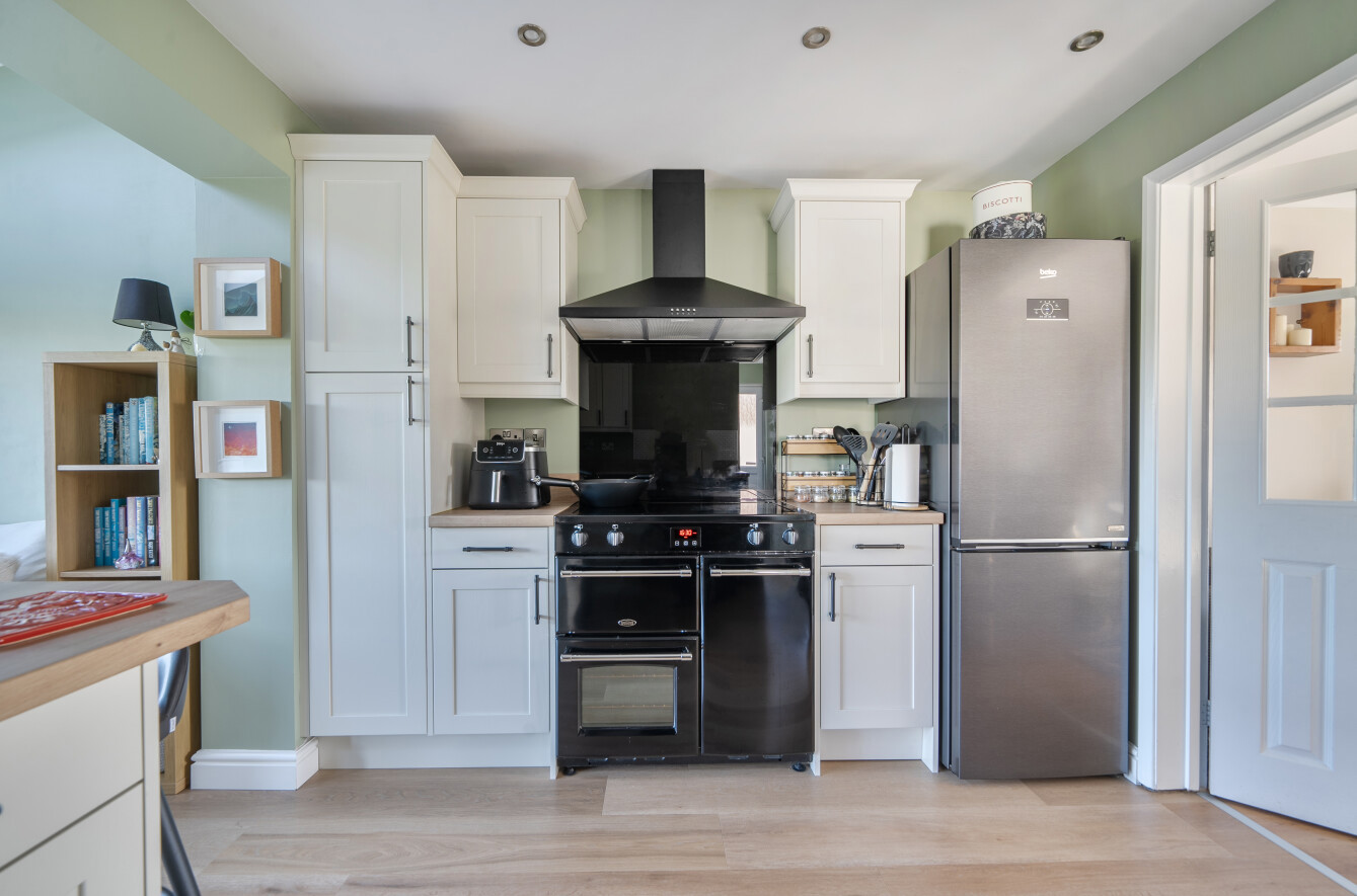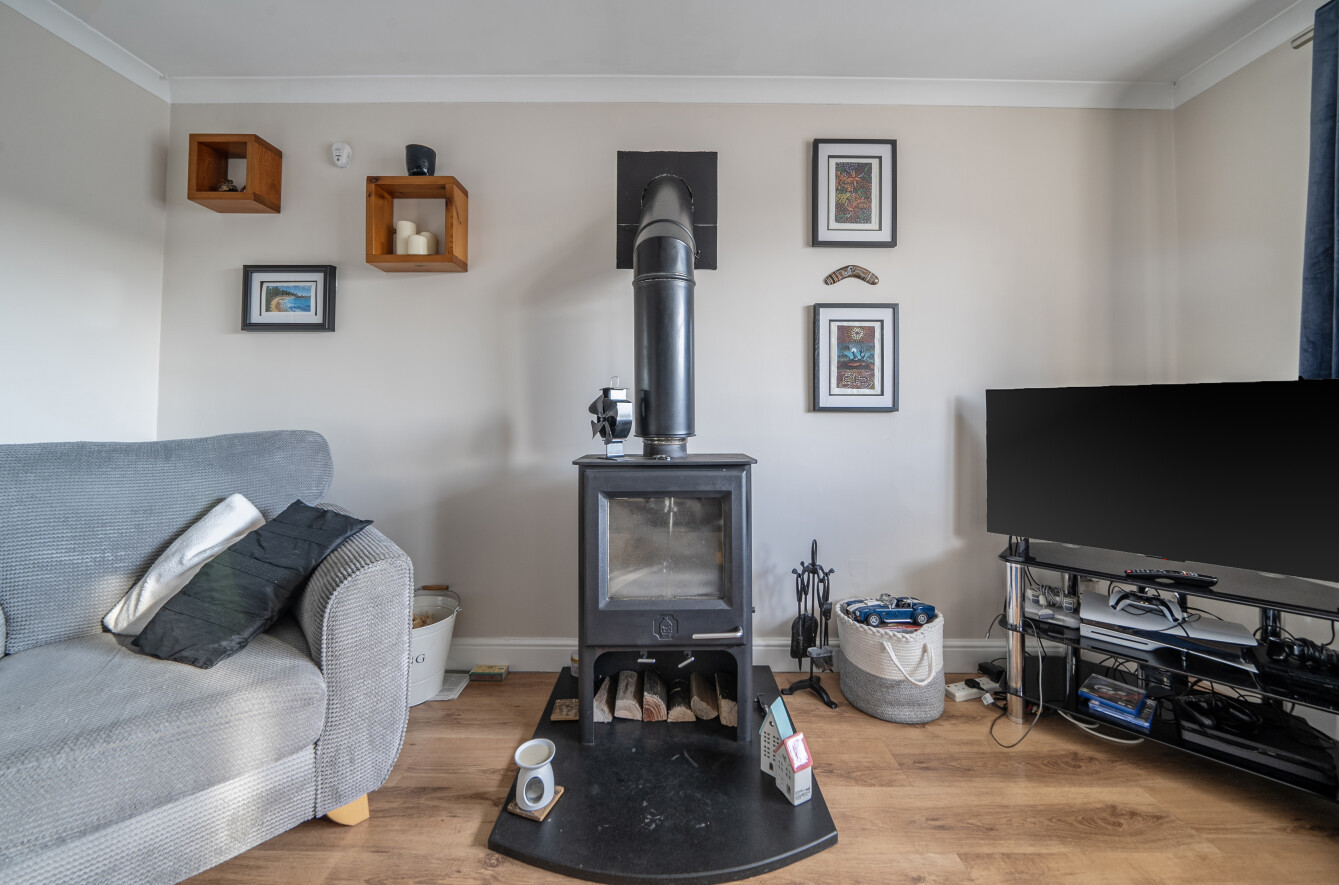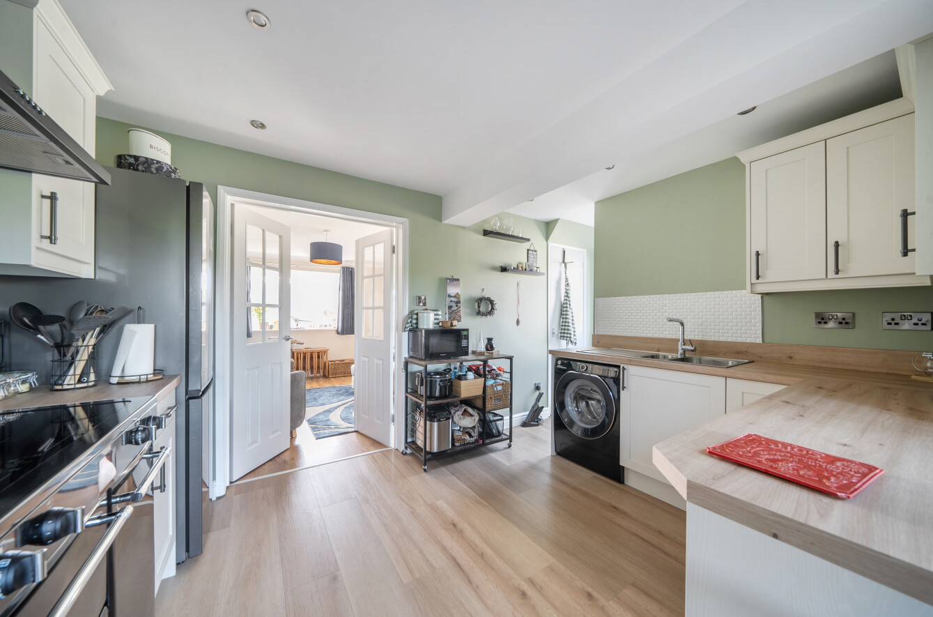 The ground floor begins with an entrance lobby leading into a bright sitting room, featuring a bay window that brings in generous natural light and a wood-burning stove for a cosy focal point. To the rear, the kitchen was replaced in 2024 and which opens hrough to an attractive extension that provides an ideal dining or family area. This versatile space enjoys excellent natural light from Velux windows and bi-fold doors, creating a seamless connection to the garden and encouraging easy indoor–outdoor living.